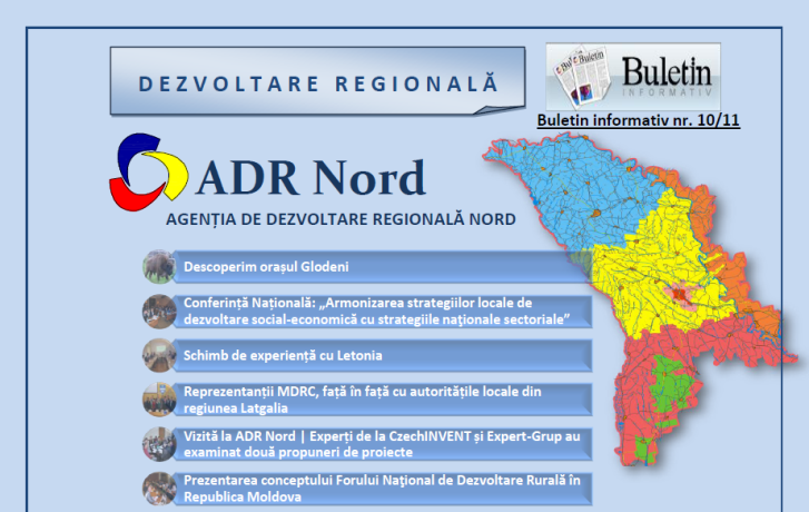 Agenția de Dezvoltare Regională Nord (ADR Nord) a elaborat Buletinul informativ nr. 10 / octombrie 2011. Buletinul, atașat mai jos, este o sinteză a activităților Agenției în luna octombrie a.c. ADR Nord a difuzat, în format electronic, nr. 10 al Buletinului informativ membrilor CNDR, CRD, angajaților MDRC, ONG-urilor, societății civile, partenerilor de dezvoltare și mass-mediei.