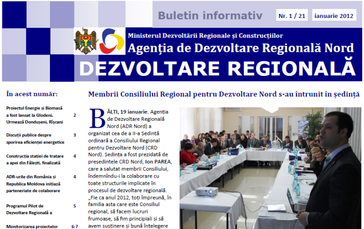 Agenția de Dezvoltare Regională Nord (ADR Nord) a elaborat Buletinul informativ nr. 1 / ianuarie 2012. Buletinul, atașat mai jos, este o sinteză a activităților Agenției în luna ianuarie a.c. ADR Nord va difuza, în format electronic, nr. 1 al Buletinului informativ membrilor CNDR, CRD, angajaților MDRC, ONG-urilor, societății civile, partenerilor de dezvoltare și mass-mediei.
