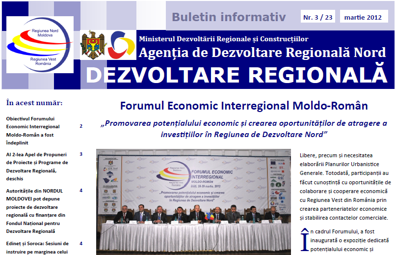 Agenția de Dezvoltare Regională Nord (ADR Nord) a elaborat Buletinul informativ nr. 3, martie 2012. Buletinul, atașat mai jos, este o sinteză a activităților Agenției în luna martie a.c. ADR Nord va difuza, în format electronic, nr. 3 al Buletinului informativ membrilor Consiliului Național de Coordonare a Dezvoltării Regionale, Consiliilor Regionale pentru Dezvoltare, angajaților Ministerului Dezvoltării Regionale și Construcțiilor, ONG-urilor, societății civile, partenerilor de dezvoltare și mass-mediei.