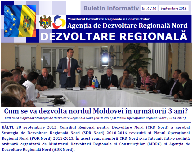 ADR Nord a difuzat, în format electronic, nr. 9 al buletinului informativ membrilor Consiliului Național de Coordonare a Dezvoltării Regionale, Consiliilor Regionale pentru Dezvoltare, angajaților Ministerului Dezvoltării Regionale și Construcțiilor, ONG-urilor, societății civile, partenerilor de dezvoltare și mass-mediei.