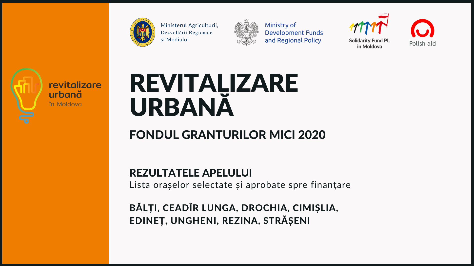 Municipiile Bălți, Edineț și orașul Drochia, alături de cinci localități urbane din alte regiuni ale țării, au obținut granturi pentru implementarea proiectelor de revitalizare urbană în cadrul apelului de propuneri al Fondului Granturilor Mici (FMG) 2020 - ediția Revitalizare Urbană. În cadrul apelului, au fost înregistrate 14 dosare, dintre care 8 au fost selectate. Bugetul total al apelului FGM 2020 - ediția Revitalizare Urbană de până la 3.900.000 MDL va fi acordat orașelor în implementarea proiectelor de dezvoltară urbană cu implicarea comunității, realizarea ideilor inovative de infrastructură, depășirea situațiilor de criză etc. Informație detaliată privind dosarele selectate și aprobate spre finanțare de către echipa de evaluare a conținutului, poate fi accesată AICI, iar informația privind rezultatele evaluării formale poate fi vizualizată AICI. Procesul de Revitalizare Urbană, prin acțiunile sale integrate, își propune să asigure un dialog continuu dintre autoritățile locale și comunitățile urbane pentru realizarea ideilor inovative de dezvoltare urbană. Astfel, zonele de revitalizare, alese împreună, vor beneficia de îmbunătățiri atât la nivel de infrastructură, cât și în procesul de consolidare a comunității și vecinătății. Necesitățile orașelor și proiectele create vor fi identificate în baza Programelor de Revitalizare Urbană în vigoare, elaborate și aprobate în conformitate cu Liniile Directoare. Echipa Solidarity Fund PL în Moldova va continua să sprijine inițiativele de dezvoltare a orașelor. Dacă doriți să obțineți informații suplimentare referitor la rezultatele evaluării și selectării, sau argumentarea punctajului obținut și deciziilor luate în cadrul apelului de propuneri FGM 2020 - ediția Revitalizare Urbană, vă rugăm să transmiteți o solicitare la următoarea adresă electronică: [email protected]. FGM 2020 - ediția Revitalizare Urbană este organizată în parteneriat cu Ministerul Agriculturii, Dezvoltării Regionale și Mediului al Republicii Moldova și Ministerul Fondurilor pentru Dezvoltare și Politică Regională al Republicii Polonia. Apelul este cofinanțat din fondurile programului polonez de cooperare pentru dezvoltare al Ministerului Afacerilor Externe al Republicii Polone - Polish Aid. |