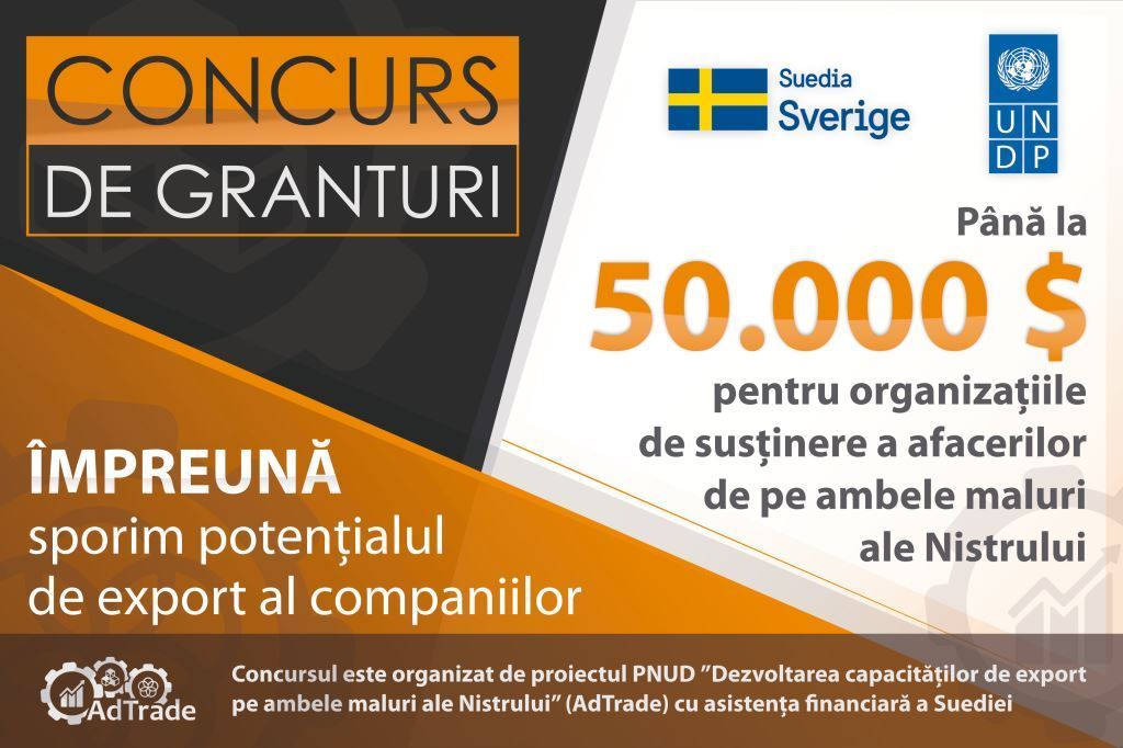 Suedia și Programul Națiunilor Unite pentru Dezvoltare oferă asistență financiară pentru organizațiile de susținere a afacerilor în scopul dezvoltării capacităților lor de promovare și prestare a serviciilor necesare întreprinderilor micro, mici și mijlocii (ÎMMM) de pe ambele maluri ale Nistrului, companii afectate grav de criza pandemică. La concurs pot participa organizațiile de susținere a afacerilor de pe ambele maluri ale Nistrului (asociații sectoriale, camere de comerț și industrie, prestatori de servicii business), care vor forma parteneriate din cel puțin două entități și vor propune soluții fezabile pentru îmbunătățirea politicilor și instrumentelor de recuperare a ÎMMM-urilor de pe ambele maluri ale Nistrului, în special, a companiilor exportatoare. Pentru fiecare parteneriat poate fi solicitat câte un grant în valoare de până la 50.000 de dolari. Activitățile prevăzute în propunerile de proiect vor fi desfășurate în perioada noiembrie 2020 - decembrie 2021. Formularele de depunere a dosarelor, condițiile de participare la concurs, precum și criteriile de evaluare sunt disponibile aici https://sc.undp.md/tndr/2146/. Termenul limită de depunere a cererii este 15 octombrie 2020, ora 16.00. Asistența financiară nerambursabilă oferită de Suedia în cadrul proiectului PNUD „Dezvoltarea capacităților de export pe ambele maluri ale Nistrului" (AdTrade) pentru organizațiile selectate va contribui pe termen lung la îmbunătățirea mediului de afaceri, crearea locurilor de muncă și constituirea parteneriatelor între companiile de pe ambele maluri ale Nistrului pentru a depăși consecințele crizei pandemice, pentru a spori potențialul de export și a accesa piețele străine. Proiectul AdTrade oferă asistență pentru crearea unor legături comerciale pe termen lung între antreprenorii de pe ambele maluri ale Nistrului și la edificarea unui mediu de încredere și de cooperare în regiune. Inițiativa stimulează și promovează exporturile de mărfuri și servicii din regiune, prin accesarea oportunităților oferite de Acordul de Liber Schimb Aprofundat și Cuprinzător (DCFTA). Proiectul susține dezvoltarea și sporirea competitivității întreprinderilor micro, mici și mijlocii (ÎMMM) și contribuie la crearea noilor companii, ceea ce, implicit, va conduce la îmbunătățirea condițiilor de trai ale locuitorilor de pe ambele maluri ale Nistrului. Proiectul este implementat de PNUD în perioada 2019-2022, cu asistența financiară a Suediei. Persoană de contact: Natalia Costaș, consultantă în comunicare și relații media, proiectul PNUD/AdTrade. Tel.: 0 69 22 11 41; e-mail: [email protected]