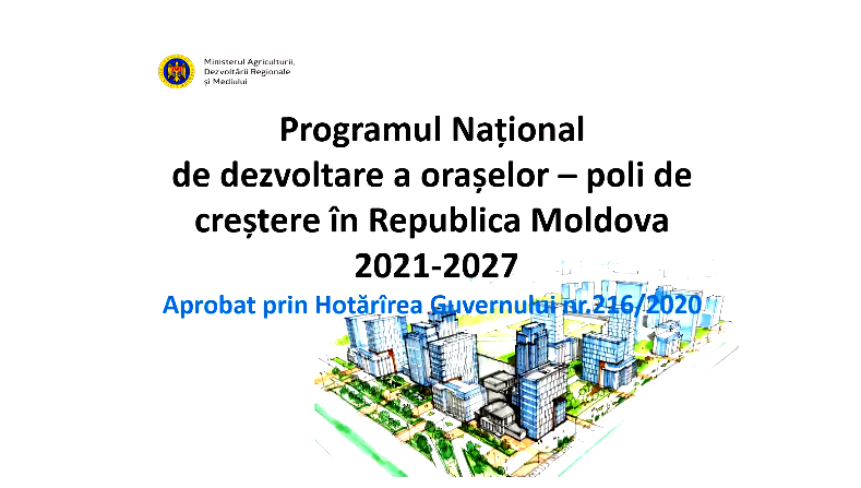 Ministerul Agriculturii, Dezvoltării Regionale și Mediului (MADRM) a organizat joi, 15 aprilie 2021, un atelier de lucru la nivel național în vederea bunei implementări a Programului național de dezvoltare a orașelor-poli de creștere în Republica Moldova pentru ani 2021-2027. Evenimentul a avut loc în mediul online și a întrunit autorități publice centrale și locale, reprezentanți ai instituțiilor de dezvoltare regionale din țară și parteneri de dezvoltare. Ministrul Agriculturii, Dezvoltării Regionale și Mediului, Ion Perju, a menționat, în cuvântul său de salut, că implementarea Programului urmărește soluționarea problemelor fundamentale de dezvoltare socio-economică în municipiile Cahul, Comrat, Ungheni, Orhei, Soroca și Edineț și valorificarea potențialului acestora. „Programul prevede implementarea unui portofoliu de proiecte ce reflectă prioritățile individuale specifice fiecărui municipiu, determinate în baza evaluării necesităților minime pentru consolidarea potențialului de orașe-poli de creștere regională. Proiectele vor fi orientate spre reabilitarea infrastructurii drumurilor, dezvoltarea sistemului de transport urban, construcția piețelor agro-alimentare, amenajarea zonelor de odihnă și agrement, dezvoltarea infrastructurii spațiilor publice, extinderea rețelelor de canalizare”, a precizat ministrul. La rândul său, directorul ADR Nord, Maria Prisacari, a felicitat MADRM și partenerii de dezvoltare pentru buna organizare a evenimentului online și a dat asigurări că ARD Nord va oferi suportul necesar pentru susținerea implementării Programului în municipiile selectate din nordul republicii. În prezentarea pe care a făcut-o Programului, șeful Direcției politici de dezvoltare regională (DPDR), Igor Malai, a oferit detalii privind modalitatea de implementare și specificul acestuia. Între altele, funcționarul MADRM a specificat că Programul conține patru componente: (1) conectivitate și mobilitate urbană; (2) competitivitate și susținerea activităților economice; (3) revitalizare urbană și dezvoltarea infrastructurii spațiilor publice; (4) modernizarea infrastructurii tehnico-edilitare și rețelelor de unități publice. În același context, șeful DPDR s-a referit la potențialele linii de finanțare, surselele preliminare de acoperire financiară și rezultatele scontate. În cadrul atelierului, experți GIZ Moldova au oferit consultanță și recomandări pe marginea creării și operaționalizării, la nivel municipal, a Unității de Implementare a Programului. De asemenea, experții au oferit îndrumări utile referitoare la elaborarea și aprobarea Planurilor operaționale locale de implementare a Programului, precum și la armonizarea documentației de urbanism și planificare strategică în conformitate cu prevederile Programului. ADR Nord urmează să acorde administrațiilor publice locale din municipiile Edineț și Soroca suport în procesul de elaborare a Planurilor operaționale de implementare a Programului la nivel local și să ofere asistență informațională și suport în elaborarea / actualizarea documentației strategice și urbanistice a municipiilor beneficiare ale Programului. În acest sens, primele ședințe cu participarea administrațiilor municipiilor Soroca și Edineț au avut loc în luna martie a.c. Totodată, în perioada august-septembrie 2021 este planificată o vizită de studiu privind orașele-poli de creștere regională. La rândul lor, autoritățile locale din municipiile beneficiare urmează să înainteze, în perioada septembrie-octombrie 2021, propuneri de proiecte către ADR Nord, care le va aviza și le va include în Planul anual de finanțare. Programul național de dezvoltare a orașelor-poli de creștere în Republica Moldova pentru ani 2021-2027 are drept scop dezvoltarea socio-economică a șase municipii – centre regionale din Republica Moldova, printre care și municipiile Soroca și Edineț, în vederea transformării acestora în poli de creștere, capabili să susțină extinderea dezvoltării în zonele rurale proxime și să asigure ocuparea forței de muncă, astfel încât rețeaua de orașe-poli de creștere regională să devină atractivă pentru locuitori, antreprenori și vizitatori. Obiectivele specifice al Programului urmăresc îmbunătățirea mobilității și a calității infrastructurii de acces cu zonele adiacente; dezvoltarea și echiparea infrastructurilor și serviciilor de suport economic pentru a stimula competitivitatea; revitalizarea urbană și dezvoltarea infrastructurii spațiilor publice; modernizarea infrastructurii tehnico-edilitare și a rețelelor de utilități publice. Programul național de dezvoltare a orașelor-poli de creștere în Republica Moldova, aprobat de Guvernul RM în decembrie 2020, a fost elaborat pentru asigurarea implementării Legii nr. 239/2016 cu privire la aprobarea Strategiei Naționale de Dezvoltare Regională pentru anii 2016-2020. Implementarea Programului urmează să sprijine realizarea Agendei 2030 de dezvoltare durabilă în Republica Moldova. Atelierul de lucru din 15 aprilie 2021 a fost organizat de Ministerul Agriculturii, Dezvoltării Regionale și Mediului cu suportul proiectului „Modernizarea Serviciilor Publice Locale în Republica Moldova”, implementat de GIZ Moldova, și finanțat de Ministerul German pentru Cooperare Economică și Dezvoltare (BMZ).