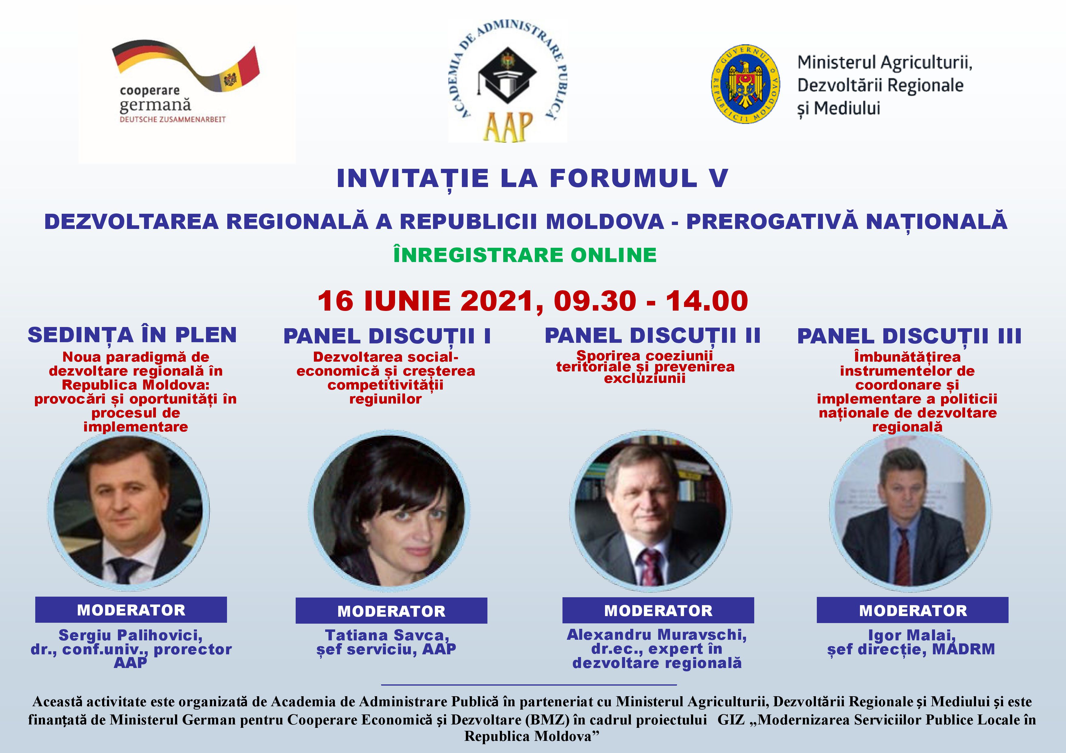 Cel de-al V-lea forum privind dezvoltarea regională cu genericul „Dezvoltarea regională a Republicii Moldova – prerogativă națională”. Forumul va fi organizat în data de 16 iunie 2021, în intervalul orelor 09.30-14.00, de Academia de Administrare Publică (AAP) în colaborare cu Agenția de Cooperare Internațională a Germaniei (GIZ) și Ministerul Agriculturii, Dezvoltării Regionale și Mediului. Formatul desfășurării Forumului va fi mixt: în sala mare a Academiei de Administrare Publică și online, prim intermediul platformei Zoom. La forum sunt invitați reprezentanți ai autorităților publice locale de ambele niveluri, administrației publice centrale, societății civile, mediului academic. Invitații vor participa online, având posibilitatea să intervină cu întrebări, comentarii, propuneri etc. Detalii despre eveniment se găsesc pe site-ul AAP. Înregistra AICI.