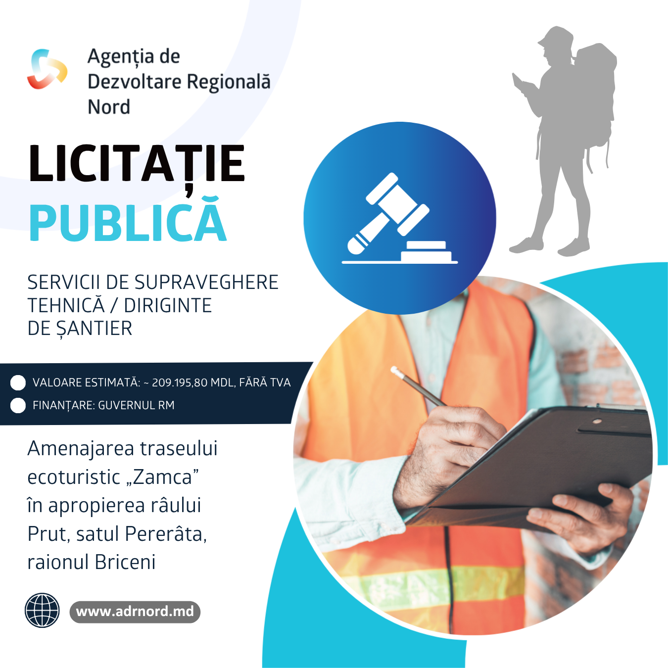 Agenția de Dezvoltare Regională Nord a lansat procedura de licitație publică pentru achiziționarea serviciilor de supraveghere tehnică (diriginte de șantier) în cadrul proiectului „Amenajarea traseului ecoturistic «Zamca» în apropierea râului Prut, satul Pererâta, raionul Briceni”. Proiectul prevede crearea și diversificarea serviciilor turistice din zona peisagistică naturală „Zamca”, în vederea creșterii atractivității turistice a Regiunii de Dezvoltare Nord. În acest sens, sunt planificate o serie de lucrări pentru crearea infrastructurii turistice de cazare și de agrement, precum și amenajarea căilor de acces. De investiția în valorificarea traseului ecoturistic „Zamca” vor beneficia nu doar locuitorii satului Pererâta și ai raionului Briceni, dar și cei peste 644 de mii de cetățeni care locuiesc în Regiunea de Dezvoltare Nord. De asemenea, printre beneficiarii proiectului se numără peste 20 de mii de turiști din alte regiuni ale țării și de peste hotare. Valoarea totală a serviciilor de supraveghere tehnică a fost estimată la 209.195,80 MDL, fără TVA. Proiectul este finanțat de Guvernul Republicii Moldova, prin Fondul Național pentru Dezvoltare Regională și Locală, cofinanțat de Consiliul Raional Briceni și implementat de Agenția de Dezvoltare Regională Nord. Perioada clarificărilor: 30 octombrie 2025, 19:16 – 11 noiembrie 2025, 12:00 Perioada de depunere a ofertelor: 11 noiembrie 2025, 12:00 – 24 noiembrie 2025, 11:00 Criteriu de atribuire: Prețul cel mai scăzut.