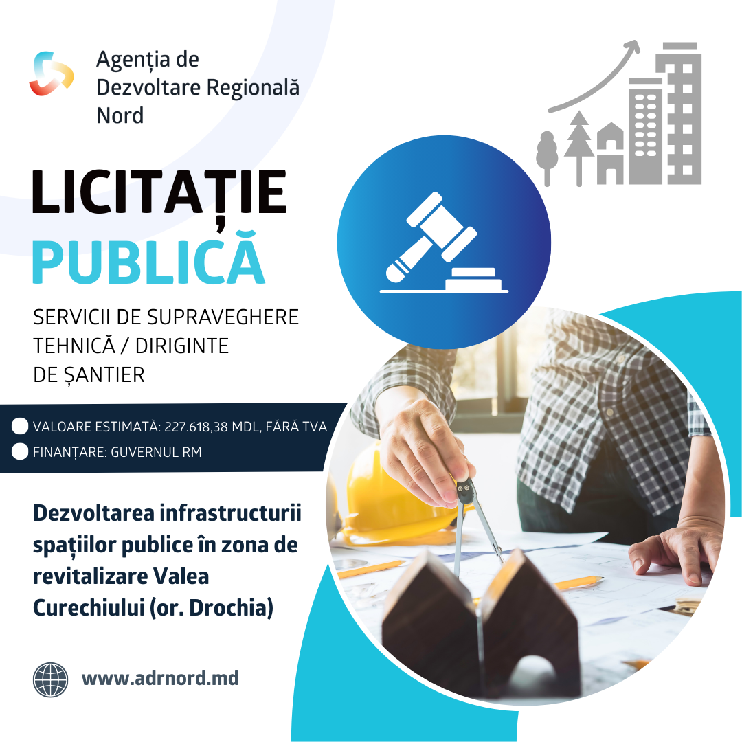 Agenția de Dezvoltare Regională Nord a lansat procedura de licitație publică pentru achiziționarea serviciilor de supraveghere tehnică (diriginte de șantier) în cadrul proiectului „Dezvoltarea infrastructurii spațiilor publice în zona de revitalizare Valea Curechiului”. Din grupul-țintă al proiectului fac parte 4.500 de locuitori ai zonei de revitalizare Valea Curechiului, dintre care circa 22% sunt persoane cu dizabilități sau alte nevoi speciale. Din grupul-țintă mai fac parte Catedrala „Adormirea Maicii Domnului”, Liceul Teoretic „Ștefan cel Mare”, Instituția de Educație Timpurie nr. 9 „Mărțișor” și centrele de plasament. Beneficiari finali ai proiectului sunt circa 17 mii de locuitori ai orașului Drochia. În cadrul proiectului va fi modernizată strada Alexandru cel Bun pe o lungime de 1,5 km, pentru îmbunătățirea circulației, siguranței și conectivității intraurbane, va fi amenajată curtea blocului locativ Alexandru cel Bun, nr. 19, prin reabilitarea căii de acces auto și pietonal, cu scopul de a îmbunătăți funcționalitatea spațiului și condițiile de acces pentru cei 180 de locatari, vor fi create și echipate 10 stații moderne de transport public amplasate de-a lungul traseului modernizat, pentru creșterea accesibilității, confortului și utilizării transportului public, în beneficiul celor circa 2500 de utilizatori lunari din zona de revitalizare, inclusiv elevi, cadre didactice și angajați ai instituțiilor sociale. Valoarea totală a serviciilor de supraveghere tehnică a fost estimată la 227.618,38 MDL, fără TVA. Proiectul este finanțat de Guvernul Republicii Moldova, prin Fondul Național pentru Dezvoltare Regională și Locală, cofinanțat de Primăria orașului Drochia și implementat de Agenția de Dezvoltare Regională Nord. Perioada clarificărilor: 31 decembrie 2025, 17:50 – 16 ianuarie 2026, 12:00 Perioada depunerii ofertelor: 16 ianuarie 2026, 12:00 – 27 ianuarie 2026, 11:00 Criteriu de atribuire: Prețul cel mai scăzut