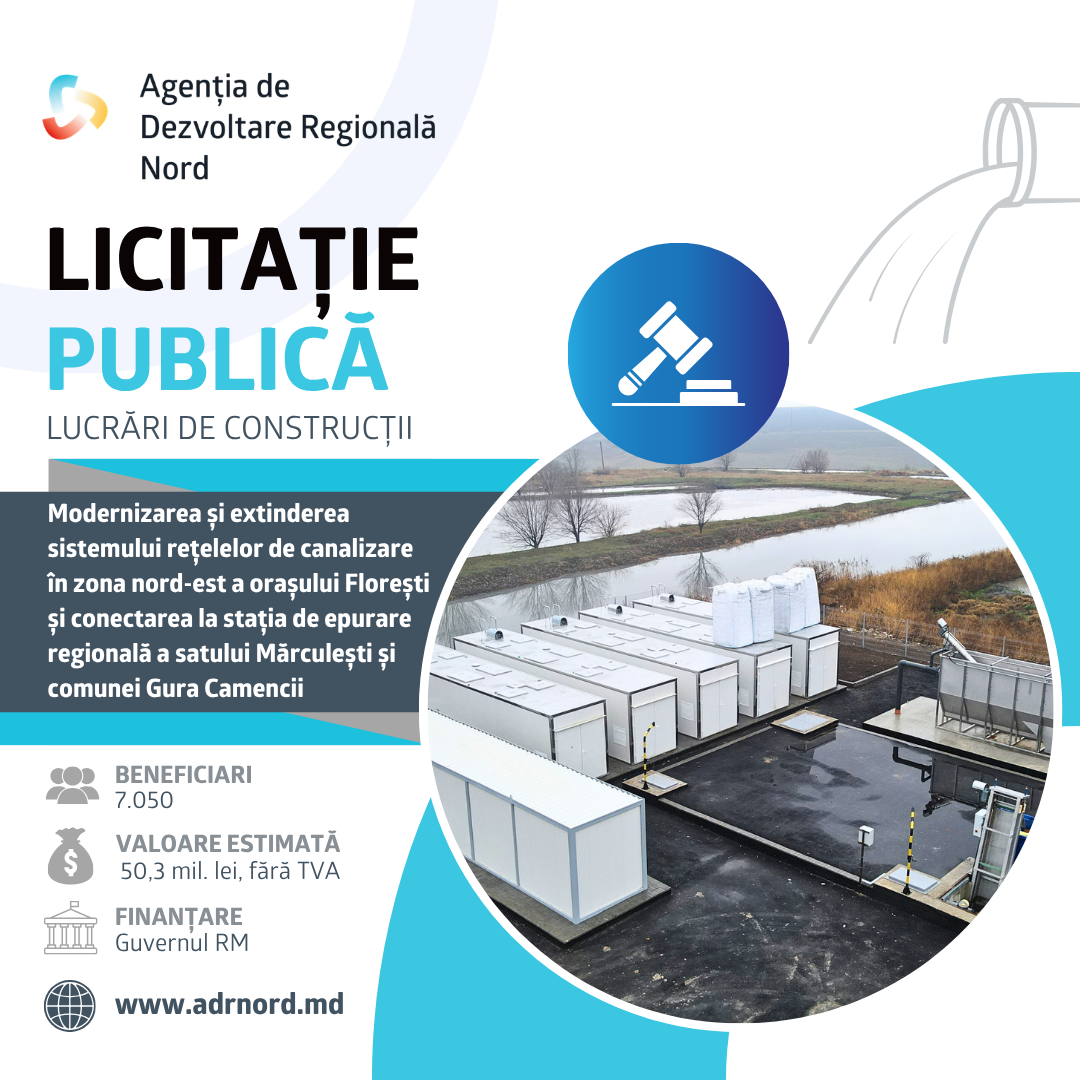 Agenția de Dezvoltare Regională Nord a lansat procedura de licitație publică pentru executarea lucrărilor de construcții în cadrul proiectului „Modernizarea și extinderea sistemului rețelelor de canalizare în zona nord-est a orașului Florești și conectarea la stația de epurare regională a satului Mărculești și comunei Gura Camencii”. În cadrul proiectului vor fi construite/reabilitate circa 20 km de rețele de canalizare și 4 stații de pompare a apelor uzate. Astfel, vor fi create premise pentru transportarea și epurarea apelor uzate din mai multe localități învecinate. În urma implementării proiectului, 7.050 de oameni din orașul Florești, satul Mărculești și comuna Gura Camencii vor avea acces la sistemul de canalizare construit/reabilitat. Totodată, vor fi create premise pentru evacuarea apelor uzate din satele Băhrinești, Lunga, Vărvăreuca și orașul Mărculești spre noua stație de epurare din preajma orașului Florești. La rândul său, S.A. „Servicii Comunale Florești”, care va gestiona infrastructura nou-creată, își va consolida poziția de operator regional. Valoarea totală a lucrărilor de construcții a fost estimată la 50.334.079 MDL, fără TVA. Proiectul este finanțat de Guvernul Republicii Moldova, prin Fondul Național pentru Dezvoltare Regională și Locală, cofinanțat de administrațiile locale beneficiare și implementat de Agenția de Dezvoltare Regională Nord. Perioada clarificărilor: 19 martie 2026, 17:25 – 31 martie 2026, 12:00 Perioada depunerii ofertelor: 31 ianuarie 2026, 12:00 – 15 aprilie 2026, 11:00 Criteriu de atribuire: Prețul cel mai scăzut