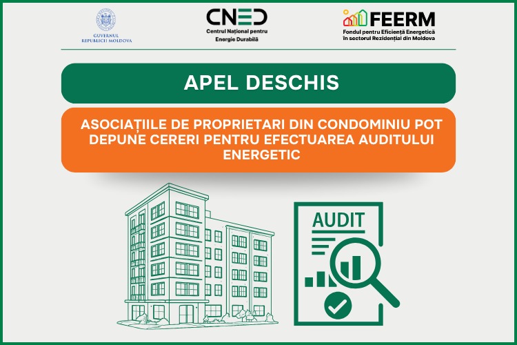 Centrul Național pentru Energie Durabilă (CNED) anunță lansarea apelului de depunere a cererilor de participare pentru efectuarea Rapoartelor de audit energetic pentru blocurile locative multietajate gestionate de Asociațiile de Proprietari din Condominiu (APC). Scopul acestui apel este de a sprijini APC-urile în evaluarea consumului actual de energie și identificarea soluțiilor eficiente de reducere a acestuia, prin implementarea măsurilor de eficiență energetică și valorificarea surselor regenerabile de energie. APC-urile care vor beneficia de suport în elaborarea raportului de audit energetic vor putea accesa, ulterior, finanțare pentru elaborarea documentației de proiect cât și implementarea măsurilor de eficiență energetică și valorificarea surselor de energie regenerabilă, co-finanțate prin programul guvernamental FEERM. „Evoluțiile acestui produs de finanțare din cadrul programului guvernamental FEERM ne-a determinat să intervenim cu unele ajustări pentru a oferi mai multă flexibilitate potențialilor beneficiari dar și o valorificare mai eficientă a bugetului alocat în acest sens. Totodată, intrarea în faza de implementare reală a proiectelor ne permite să ne axăm eforturile în scalarea produsului pentru a ajunge la cât mai mulți beneficiari care să poată să-și reducă pierderile de căldură, diminueze facturile la energie și să-și sporesc confortul”, a declarat Ion Muntean, directorul Centrului Național pentru Energie Durabilă. Asociațiile de Proprietari din Condominiu care vor beneficia de Raportul de audit energetic vor fi eligibile pentru Componenta II - documentație de proiect, conform produsului de finanțare „Eficiența energetică a blocurilor locative”, iar ulterior de a aplica la Componenta III - lucrări de construcții și obținerea unui grant de până la 70% din valoarea investiției eligibile prin Fondul pentru Eficiență Energetică în sectorul Rezidențial din Moldova (FEERM). Contribuția locatarilor reprezintă 30%. De asemenea, în funcție de gradul de vulnerabilitate energetică, proprietarii pot beneficia suplimentar de alocații din Fondul de Reducere a Vulnerabilității Energetice, acoperind între 15% și 90% din contribuția proprie. Pentru elaborarea Raportului de audit energetic APC va achita, în avans, o contribuție inițială de 10% din costul total al serviciului. Totodată, APC-urile care beneficiază de finanțare pentru auditul energetic trebuie să continue implementarea proiectului, participând la elaborarea documentației de proiect și executarea lucrărilor de construcții pentru realizarea măsurilor de reabilitare energetică a blocului locativ. În cazul în care APC nu depune cererea de finanțare pentru elaborarea documentației de proiect, aceasta va restitui integral costul Raportului de audit energetic suportat de CNED. Noutatea acestui apel este că sunt eligibile și clădirile date în exploatare după 2005, dacă acestea nu au implementat anterior lucrări de izolare termică a pereților și/sau acoperișului. Pentru a fi eligibilă în cadrul prezentului apel, fiecare APC trebuie să îndeplinească cumulativ următoarele criterii: