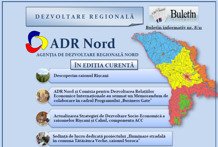 Agenția de Dezvoltare Regională Nord (ADR Nord) a elaborat Buletinul informativ nr. 8 / august 2011. Buletinul, atașat mai jos, este o sinteză a activităților Agenției în luna august a.c. ADR Nord a difuzat, în format electronic, nr. 8 al Buletinului informativ membrilor CNDR, CRD, angajaților MDRC, ONG-urilor, societății civile, partenerilor de dezvoltare și mass-mediei.