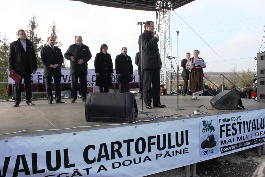 Corjeuți, Briceni, 11 noiembrie. Primul Festival al Cartofului a avut loc în satul Corjeuți, raionul Briceni. Festivalul a promovat cultura cartofului și calitatea bucatelor tradiționale gătite din cartofi. Evenimentul a fost organizat de Agenția de Dezvoltare Regională Nord și Primăria Corjeuți în parteneriat cu Ministerul Agriculturii și Industriei Alimentare, Ministerul Dezvoltării Regionale și Construcțiilor, Consiliul Raional Briceni și Federația Națională a Fermierilor din Moldova. La Festivalul Cartofului și-au prezentat produsele circa 40 de agenți economici, iar numărul vizitatorilor s-a ridicat la trei mii. La eveniment au participat prim-ministrul Vlad Filat; vicepremierul Valeriu Lazăr, ministru al Economiei; Marcel Răducan, ministru al Dezvoltării Regionale și Construcțiilor; Vasile Bumacov, ministru al Agriculturii și Industriei Alimentare. În luarea sa de cuvânt, prim-ministrul a felicitat organizatorii și locuitorii regiunii pentru ideea desfășurării acestui festival. Vlad Filat a spus că se mîndrește că agricultorii reușesc an de an nu doar să facă față greutăților, dar și să obțină recolte bogate. „Astfel de evenimente sunt binevenite, căci ne ajută să vedem lucrurile bune care se fac și ne ajută să învățăm unii de la alții cum, prin muncă, putem obține rezultate frumoase. Dacă până în anul 2009 Republica Moldova era țară importatoare de cartofi, pe parcursul ultimei perioade asistăm la faptul că nu doar producem cartofi pentru necesitățile statului, dar și reușim să exportăm. În anul 2011, peste 30 mii tone de cartofi au fost exportate”, a spus Vlad Filat, care s-a pronunțat pentru efectuarea unei analize în acest domeniu, pentru ca producătorii de cartofi să cunoască posibilitățile care există și, astfel, să-și mărească volumul de producere. La final, premierul le-a urat mult succes tuturor celor prezenți la eveniment și și-a exprimat convingerea că Festivalul Cartofului va deveni o tradiție. Un mesaj de susținere și felicitare pentru producătorii de cartofi și pentru participanții la Festivalul Cartofului a trasmis și președintele Parlamentului Republicii Moldova, Marian Lupu. Mesajul a fost prezentat publicului de către directorul Agenției de Dezvoltare Regională Nord, Ion Bodrug. „Este o primă experiență a Agenției de Dezvoltare Regională Nord de a veni în activitatea sa și cu alt tip de activități, fiindcă câțiva ani la rând s-a ocupat mai mult de proiecte de infrastructură, care sunt într-adevăr foarte importante, fiindcă, fără investiții în primul rând în infrastructură, nu există dezvoltare la nivel local”, a menționat vicepremierul, ministrul Economiei, Valeriu Lazăr. „O sărbătoare adevărată nu e cea instituită prin decrete, or, în cazul Festivalului Cartofului, inițiativa aparține în primul rând celor care au depus suflet în organizarea acestui eveniment. Următoarea etapă în dezvoltarea culturii cartofului ar însemna nu doar producerea cartofului, dar și dezvoltarea infrastructurii de prelucrare a cartofului. Fiți în continuare așa de cutezători, așa de proactivi și eu vă asigur că veți avea în continuare satisfacția care se citește în ochii dvs. astăzi”, a mai spus, în adresarea sa către agricultori, vicepremierul Valeriu Lazăr. „Sunt nespus de bucuros să fiu astăzi alături de dvs., să fim împreună cu organizatorii acestui frumos eveniment. Prin acest eveniment, am avut ca scop să scoatem în evidență producătorii de cartofi, care, într-o perioadă scurtă de timp au pus producerea pe picior agro-industrial. Vă doresc să reușiți să faceți exporturi și să demonstrați că dintr-o țară consumatoare Republica Moldova s-a transformat într-o țară exportatoare de produse agricole și în special de cartofi”, a spus Marcel Răducan, ministrul Dezvoltării Regionale și Construcțiilor, în mesajul său către producătorii de cartofi și oaspeții evenimentului. „De ce la Corjeuți, de ce în această parte a țării? Faptul că Republica Moldova s-a transformat într-o țară exportatoare de cartofi este o istorie de succes mulțumită dvs., stimați agricultori. Istoria dvs. de succes demonstrează că se poate. Vreau să vă mai rog încă cel puțin două lucruri: să facem un efort să avem o bază de semințe de cartof în această regiune, fiindcă 15 mii de tone pe an importăm și, vă rog mult, construiți o fabrică de procesare și de înghețare a cartofului, fiindcă în restaurante și în magazine toate sunt de import. Mai facem și aceste lucruri și sper că de la festival la festival ne vom putea bucura și de alte rezultate”, a spus Vasile Bumacov, ministrul Agriculturii și Industriei Alimentare. Victor Andronic, primarul de Corjeuți, a mulțumit oficialilor din Chișinău pentru că au acceptat invitația de a participa la prima ediție a Festivalului Cartofului și s-a arătat convins că acest evenimentul va deveni o sărbătoare frumoasă pentru toți locuitorii din regiune. Primarul a mulțumit agricultorilor pentru efortul depus an de an și le-a urat mult succes în activitatea pe care o desfășoară. Oficialii de la Guvern împreună cu organizatorii evenimentului au vizitat iarmarocul produselor agricole, târgul meșterilor populari, expoziția de tehnică pentru cultivarea cartofului, au degustat din bucate și au discutat cu oaspeții festivalului. De asemenea, au vizitat monumentul naturii „Stânca Å¢iglău”, care face parte din lanțul de recife apărute cu 15-20 milioane de ani în urmă în bazinul Prutului de Mijloc, la nordul Moldovei. La închiderea evenimentului, directorul ADR Nord, Ion Bodrug, a mulțumit agricultorilor, gospodinelor care au pregătit bucate alese, elevilor care au participat la concursul desenelor și oaspeților pentru participare la Festivalul Cartofului. „Această sărbătoare a cartofu