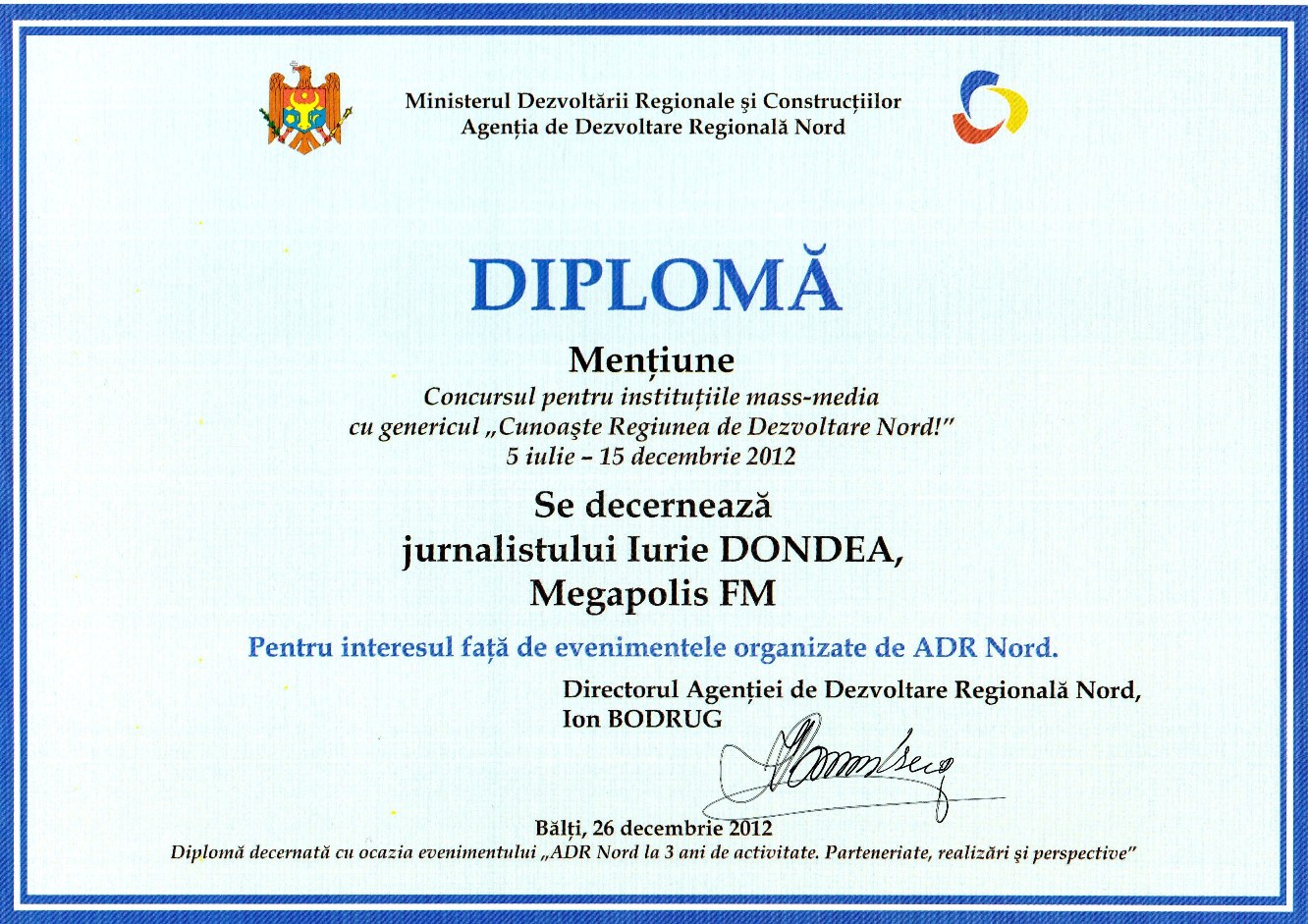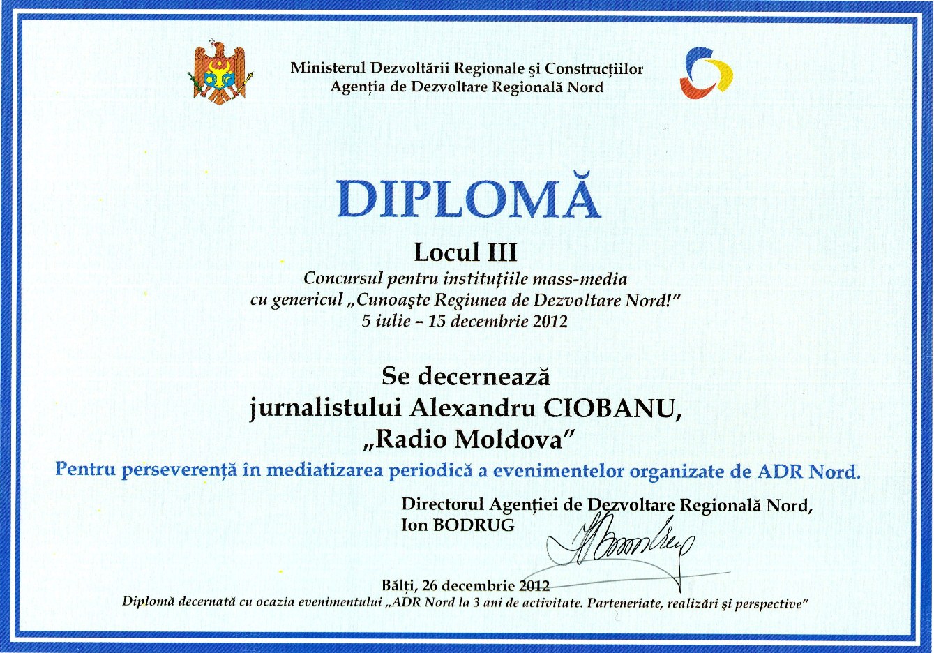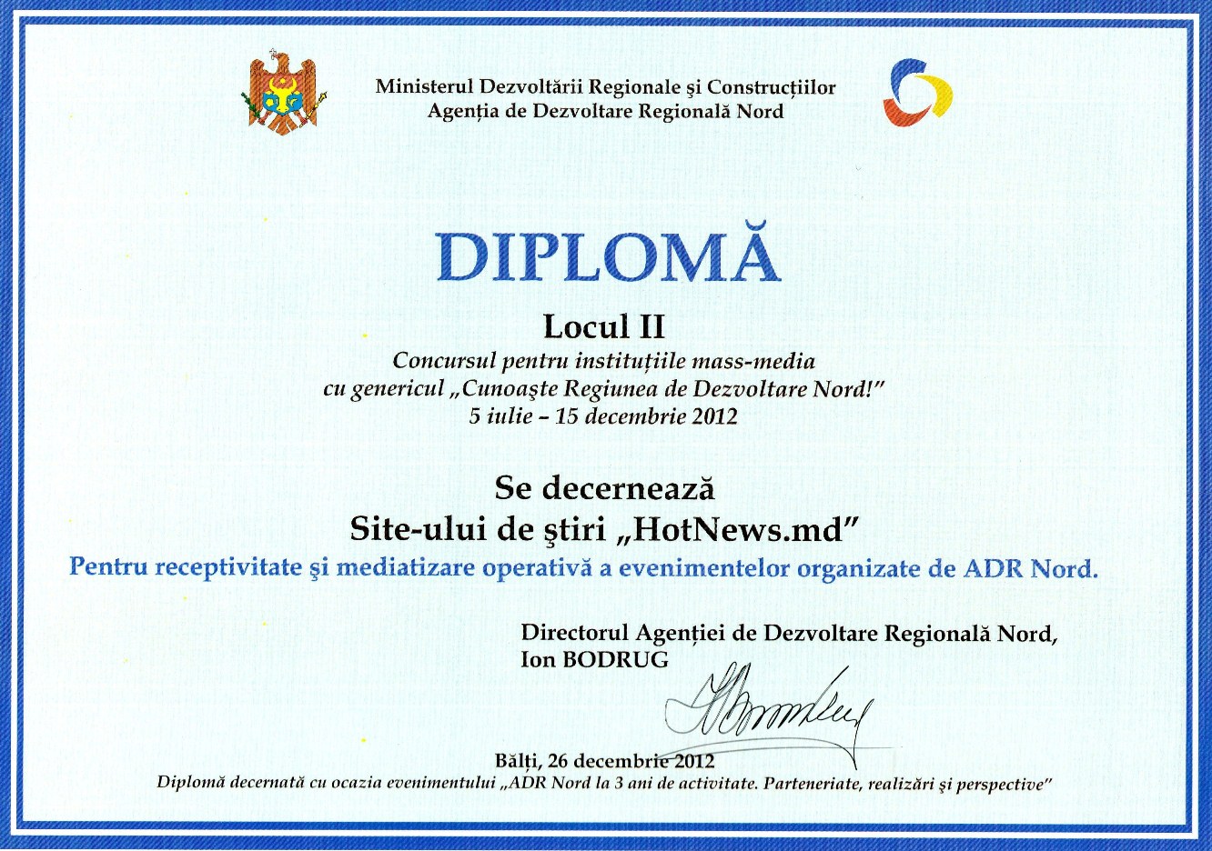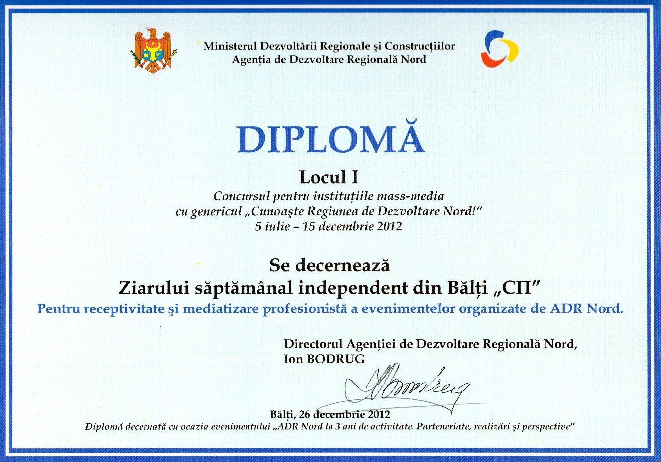 Bălți, 26 decembrie 2012. Agenția de Dezvoltare Regională Nord a anunțat, cu ocazia evenimentului „ADR Nord la 3 ani de activitate. Parteneriate, realizări și perspective”, rezultatele concursului pentru instituțiile mass-media „Cunoaște Regiunea de Dezvoltare Nord!”, lansat în data de 5 iulie și încheiat pe 15 decembrie 2012, perioadă în care 18 jurnaliști de la instituții de presă republicane și locale au relatat, în peste 30 de materiale media, despre cele mai importante activități organizate de ADR Nord. Directorul ADR Nord, Ion Bodrug, le-a mulțumit jurnaliștilor care au participat la concurs. „Succesele pe care le obține echipa ADR Nord pot fi aduse în casele fiecărui cetățean, iar asta mulțumită efortului pe care îl depun zi de zi jurnaliștii. Am acordat întotdeauna o atenție sporită relației cu instituțiile mass-media. ADR Nord este o instituție transparentă, avem ce le spune cetățenilor”, a menționat directorul Ion Bodrug. Locul I a fost acordat echipei ziarului săptămânal independent din Bălți SP, pentru receptivitate și mediatizare profesionistă a evenimentelor organizate de ADR Nord. În calitate de premiu, ziarul bălțean a primit un talon în valoare de 3000 de lei în baza căruia poate fi achiziționată tehnică electronică. De asemenea, jurnaliștii Marina Morozova și Alexandr Dzekiș de la SP, care au relatat frecvent despre activitățile ADR Nord, au primit câte un premiu special. Premiul II a fost acordat site-ului de știri HotNews.md, pentru receptivitate și mediatizare operativă a evenimentelor organizate de ADR Nord. În calitate de premiu, echipa HotNews.md a primit un talon similar în valoare de 2000 de lei. Jurnalistului Alexandru Ciobanu, reporter la Radio Moldova, i s-a acordat locul III, pentru perseverență în mediatizarea periodică a evenimentelor organizate de ADR Nord. Jurnalistul a primit un talon în valoare de 1000 de lei în baza căruia poate fi achiziționată tehnică electronică. De asemenea, pentru interes față de evenimentele organizate de ADR Nord, au fost menționați jurnaliștii Nelly Uncuță (Moldavskie Vedomosti), Iurie Dondea (Megapolis FM), Tatiana Chetrari (Moldova 1), Viorica Postolachi (Publika TV), Rodica Nemerenco (TV Prim) și Sergiu Glavațchi (Bălți TV), cărora li s-a oferit 6 taloane similare în valoare totală de 1800 de lei. Astfel, în rezultatul concursului pentru instituțiile mass-media, au fost acordate taloane în valoare totală de 8400 de lei, în baza cărora va putea fi achizioționată tehnică electronică. Precizăm că banii care au acoperit integral valoarea premiilor provin din sponsorizare. Organizarea următorului concurs pentru instituțiile mass-media va fi anunțată în luna ianuarie 2013.