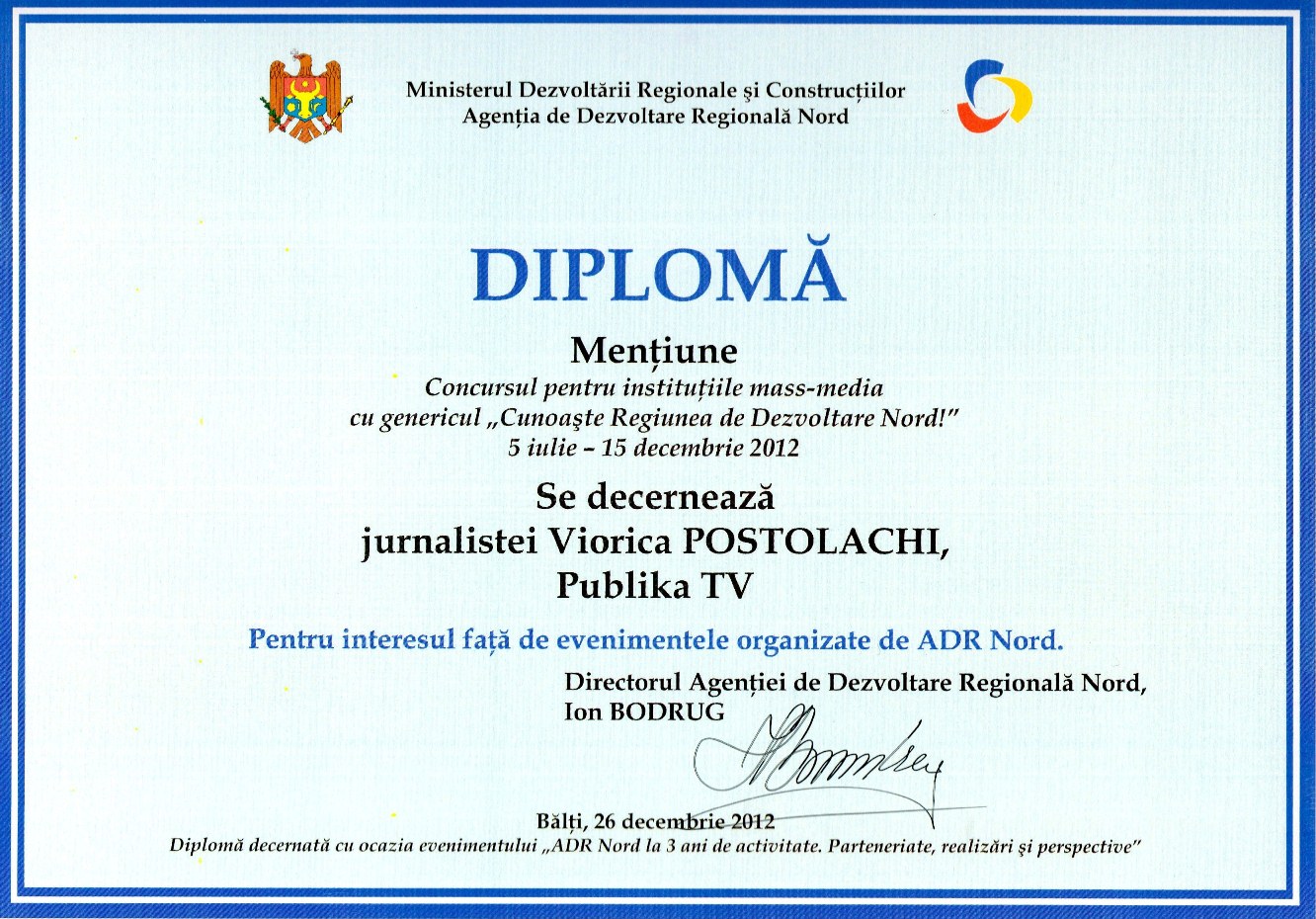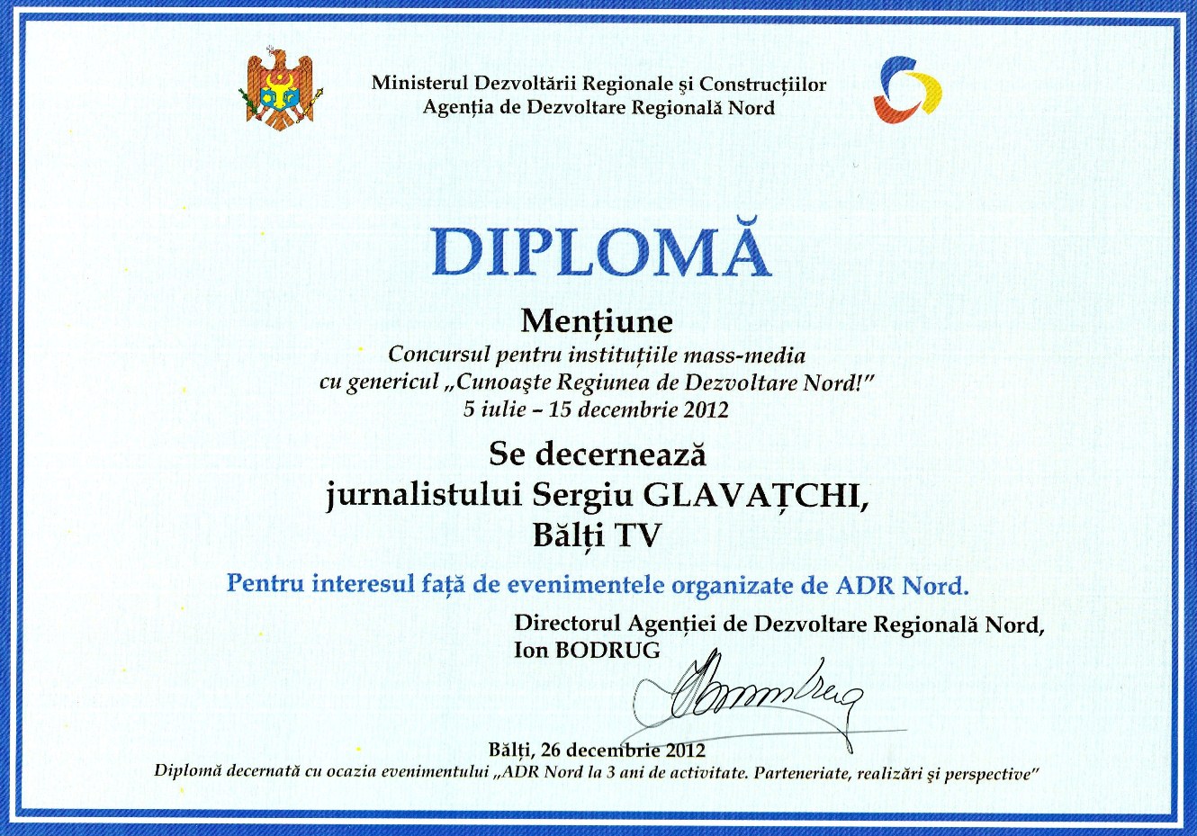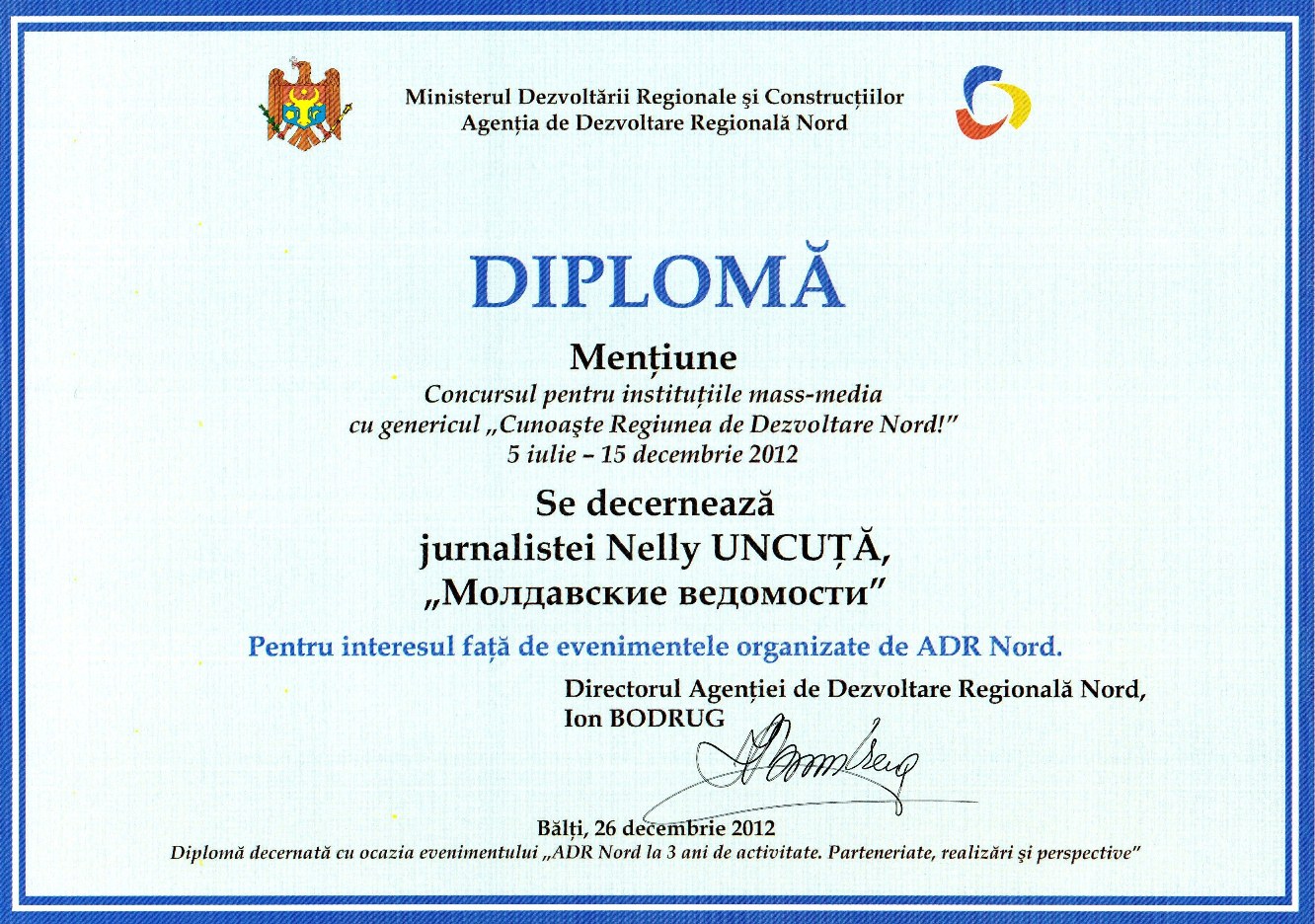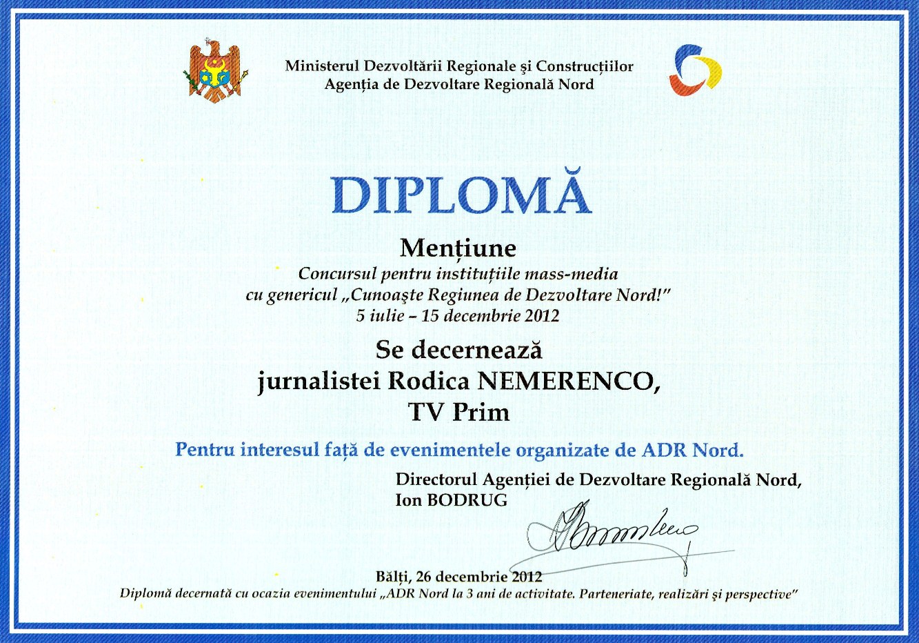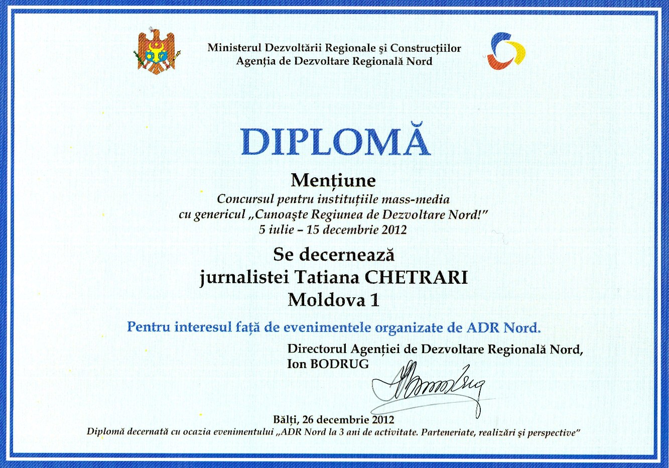 Bălți, 26 decembrie 2012. Agenția de Dezvoltare Regională Nord a anunțat, cu ocazia evenimentului „ADR Nord la 3 ani de activitate. Parteneriate, realizări și perspective”, rezultatele concursului pentru instituțiile mass-media „Cunoaște Regiunea de Dezvoltare Nord!”, lansat în data de 5 iulie și încheiat pe 15 decembrie 2012, perioadă în care 18 jurnaliști de la instituții de presă republicane și locale au relatat, în peste 30 de materiale media, despre cele mai importante activități organizate de ADR Nord. Directorul ADR Nord, Ion Bodrug, le-a mulțumit jurnaliștilor care au participat la concurs. „Succesele pe care le obține echipa ADR Nord pot fi aduse în casele fiecărui cetățean, iar asta mulțumită efortului pe care îl depun zi de zi jurnaliștii. Am acordat întotdeauna o atenție sporită relației cu instituțiile mass-media. ADR Nord este o instituție transparentă, avem ce le spune cetățenilor”, a menționat directorul Ion Bodrug. Locul I a fost acordat echipei ziarului săptămânal independent din Bălți SP, pentru receptivitate și mediatizare profesionistă a evenimentelor organizate de ADR Nord. În calitate de premiu, ziarul bălțean a primit un talon în valoare de 3000 de lei în baza căruia poate fi achiziționată tehnică electronică. De asemenea, jurnaliștii Marina Morozova și Alexandr Dzekiș de la SP, care au relatat frecvent despre activitățile ADR Nord, au primit câte un premiu special. Premiul II a fost acordat site-ului de știri HotNews.md, pentru receptivitate și mediatizare operativă a evenimentelor organizate de ADR Nord. În calitate de premiu, echipa HotNews.md a primit un talon similar în valoare de 2000 de lei. Jurnalistului Alexandru Ciobanu, reporter la Radio Moldova, i s-a acordat locul III, pentru perseverență în mediatizarea periodică a evenimentelor organizate de ADR Nord. Jurnalistul a primit un talon în valoare de 1000 de lei în baza căruia poate fi achiziționată tehnică electronică. De asemenea, pentru interes față de evenimentele organizate de ADR Nord, au fost menționați jurnaliștii Nelly Uncuță (Moldavskie Vedomosti), Iurie Dondea (Megapolis FM), Tatiana Chetrari (Moldova 1), Viorica Postolachi (Publika TV), Rodica Nemerenco (TV Prim) și Sergiu Glavațchi (Bălți TV), cărora li s-a oferit 6 taloane similare în valoare totală de 1800 de lei. Astfel, în rezultatul concursului pentru instituțiile mass-media, au fost acordate taloane în valoare totală de 8400 de lei, în baza cărora va putea fi achizioționată tehnică electronică. Precizăm că banii care au acoperit integral valoarea premiilor provin din sponsorizare. Organizarea următorului concurs pentru instituțiile mass-media va fi anunțată în luna ianuarie 2013.