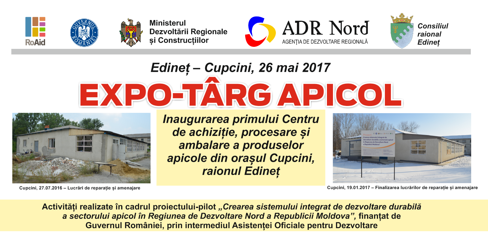 ADR Nord în parteneriat cu Ministerul Dezvoltării Regionale și Construcțiilor inaugurează vineri, 26 mai, ora 11.00, în orașul Cupcini, raionul Edineț, primul Centru de achiziție, procesare și ambalare a produselor apicole din nordul Moldovei, reparat și amenajat în cadrul proiectului-pilot „Crearea sistemului integrat de dezvoltare durabilă a sectorului apicol în Regiunea de dezvoltare Nord a Republicii Moldova”, finanțat de Guvernul României cu 157.382 de euro, prin intermediul Asistenței Oficiale pentru Dezvoltare (RoAid). După inaugurarea Centrului apicol din Cupcini, în municipiul Edineț va avea loc, începând cu ora 11.30, un expo-târg apicol, în cadrul căruia cetățenii vor putea să procure produse apicole. Ulterior, la ora 12.00, în incinta Consiliului Raional Edineț, se va desfășura conferința de finalizare a proiectului-pilot menționat. Printre invitații la evenimentele prilejuite de finalizarea proiectului-pilot sunt ministrul Dezvoltării Regionale și Construcțiilor, Vasile Bîtca, ambasadorul României în Republica Moldova, E.S. Daniel Ioniță, și președintele raionului Edineț, Iurii Garas. Prin realizarea proiectului-pilot apicol de la Edineț, ADR Nord și-a propus să contribuie la crearea unui sistem integrat de dezvoltare durabilă a sectorului apicol în Regiunea de dezvoltare Nord prin dezvoltarea unui sistem de achiziții, stocare, procesare și ambalare de produse apicole la nivel regional. |