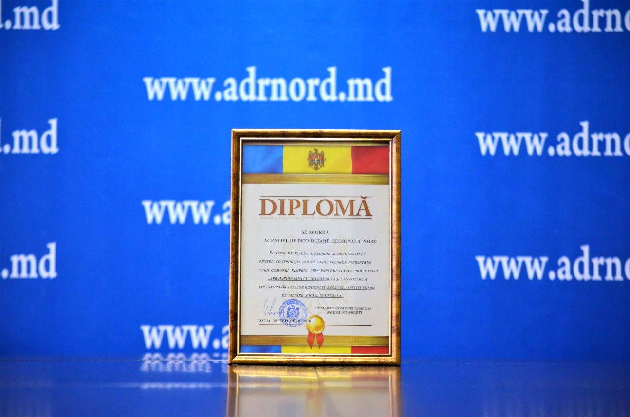 Prima - Noutăți - Primăria comunei Risipeni a acordat ADR Nord o diplomă în semn de înaltă apreciere și recunoștință pentru implementarea unui proiect de aprovizionare cu apă