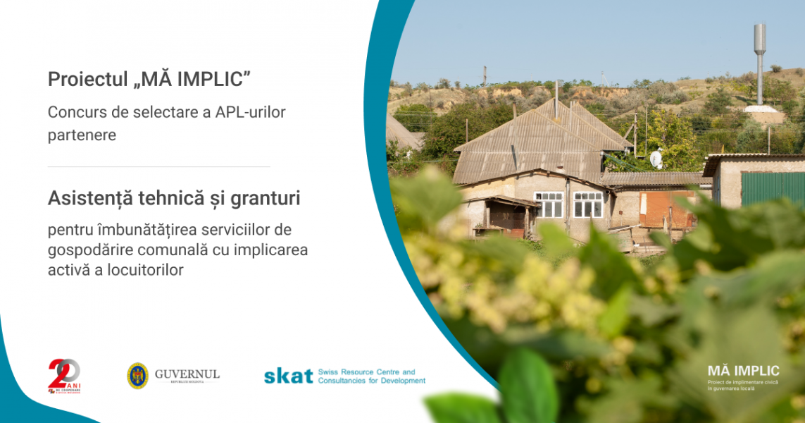 Proiectul de implicare civică în guvernarea locală „MĂ IMPLIC” anunță concurs de selectare a APL-urilor/grupuri de APL-uri partenere. Proiectul va sprijini autoritățile publice locale din 30 localități/grupuri de localități pentru a organiza furnizarea de servicii de gospodărire comunală într-un mod participativ, eficient, incluziv și durabil. Proiectul încurajează abordări inovatoare de îmbunătățire a serviciilor de gospodărire comunală, cooperare între localități și APL-uri și acțiuni ce vor asigura o mai bună gestiune și administrare a serviciilor de gospodărie comunală. Locuitorii vor fi, de asemenea, implicați în luarea deciziilor la nivel local și în monitorizarea furnizării serviciilor în localitățile partenere. Dosarul de aplicare va include: