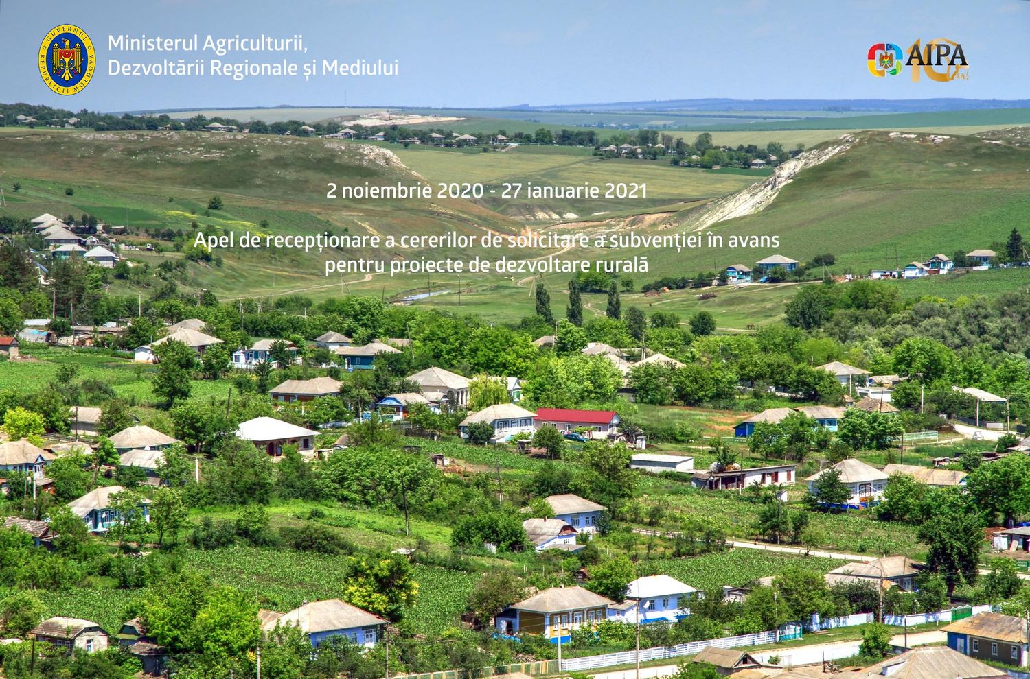 Ministerul Agriculturii, Dezvoltării Regionale și Mediului (MADRM) a lansat luni, 2 noiembrie 2020, cel de-al III-lea apel de depunere a dosarelor de solicitare a subvenției în avans pentru proiecte de dezvoltare rurală și îmbunătățire a nivelului de trai și de muncă în mediul rural. Dosarele de solicitare a subvenției în avans pentru noile măsuri de dezvoltare rurală vor fi depuse până pe 27 ianuarie 2021 la Agenţia de Intervenţie şi Plăţi pentru Agricultură (AIPA). Conform Regulamentului, aprobat prin Hotărârea Guvernului nr. 476/2019, subvenții vor fi oferite pentru trei măsuri de sprijin: