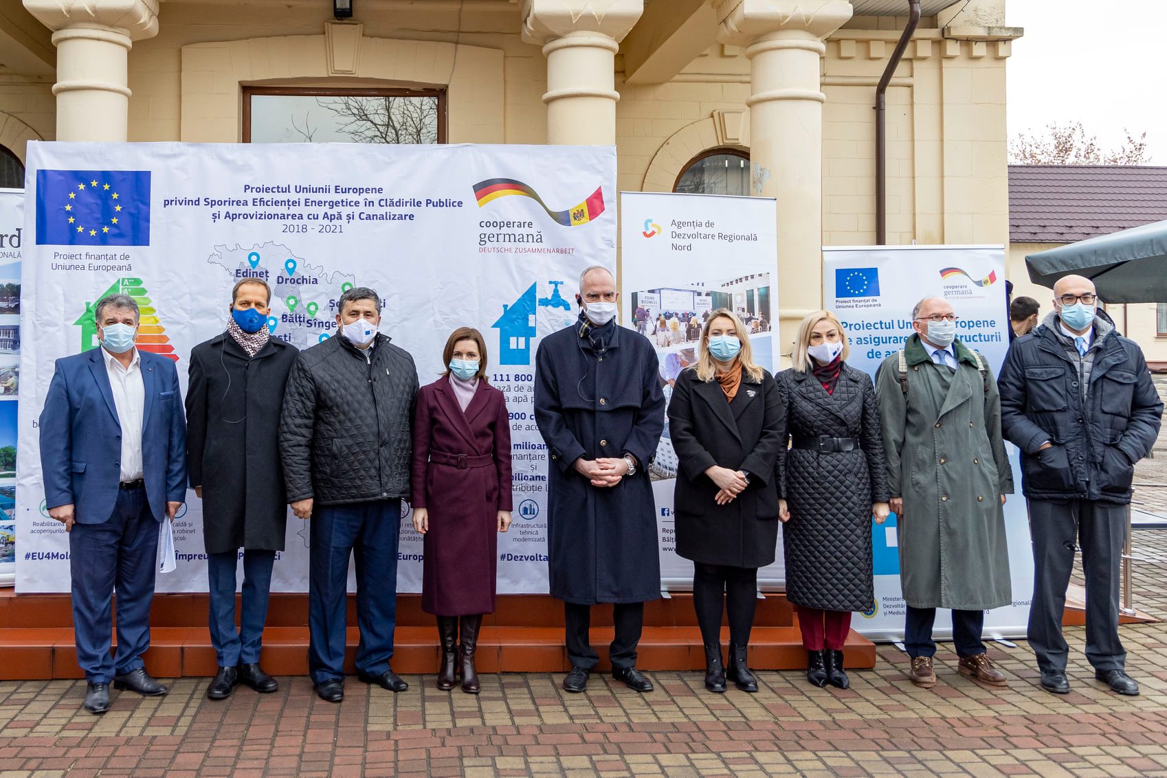 Luni, 29 noiembrie 2021, în orașul Edineț au fost lansate oficial lucrările de construcție-montaj privind îmbunătățirea serviciilor de aprovizionare cu apă. Scopul acestui proiect implementat de Agenția de Dezvoltare Regională (ADR) Nord în cooperare cu Proiectul „Modernizarea Serviciilor Publice Locale în Republica Moldova”, cu suportul Uniunii Europene, este asigurarea locuitorilor orașului Edineț cu servicii calitative de alimentare cu apă. La eveniment au participat președintele Republicii Moldova, secretarul de stat din cadrul Ministerului Infrastructurii și Dezvoltării Regionale (MIDR), ambasadorul Uniunii Europene în Republica Moldova, reprezentanți ai Ambasadei Germaniei în Republica Moldova, conducerea ADR Nord, reprezentanți ai Agenției de Cooperarea Internațională a Germaniei (GIZ), autorități publice locale, reprezentanți ai companiei de construcții, locuitori ai orașului Edineț, precum și reprezentanți ai societății civile. Maia Sandu, președintele Republicii Moldova: „Mulțumim Uniunii Europene și Germaniei pentru sprijinul financiar oferit pentru proiectele din Edineț, dar și din multe alte localități ale republicii. Vom continua să identificăm și să valorificăm resurse pentru investiții în infrastructură, astfel încât asemenea proiecte de dezvoltare să fie realizate în toate regiunile țării. Condițiile bune de trai în sate și orașe, alături de locurile de muncă bine plătite, sunt șansa noastră ca oamenii să rămână acasă și să contribuie la prosperarea comunităților și a țării noastre.” Ana Mardare, secretar de stat, MIDR: „Din numele ministerului pe care îl reprezint, vă spun că aveți tot sprijinul în dezvoltarea acestor proiecte și vom oferi tot suportul de fiecare dată când va fi necesar. Ne bucură mult faptul că acest proiect se desfășoară cu implicarea locuitorilor și se reflectă în contribuția locală de 8 mln de lei, alocată pentru acest proiect. Este un act de mobilizare de apreciat.” ES Jānis Mažeiks, ambasadorul Uniunii Europene în Republica Moldova: „Proiectul de îmbunătățire a serviciilor de alimentare cu apă din orașul Edineț, ca și proiectele similare din orașele Fălești și Drochia, finalizate recent, urmăresc să îmbunătățească accesul populației la apă potabilă sigură. Uniunea Europeană continuă să sprijine cetățenii Republicii Moldova prin proiecte, care să contribuie la îmbunătățirea calității vieții. Uniunea Europeană contribuie la modernizarea infrastructurii pentru furnizarea serviciilor de aprovizionare cu apă în 18 localități din Republica Moldova, prin intermediul Programului privind eficiența energetică, aprovizionarea cu apă și canalizare, împreună cu partenerii noștri de la GIZ.” Ullrich Kinne, șeful adjunct al misiunii R.F. Germania în Republica Moldova: „Acest proiect, ca și altele de acest gen, au fost rezultatul unei planificări regionale de mai mulți ani și a unui proces de prioritizare participativă, care a fost sprijinită de Uniunea Europeană și Germania, și au fost implementate de ADR Nord împreună cu GIZ Moldova, cărora le mulțumesc pentru această cooperare reușită. Cooperarea cu succes dintre Uniunea Europeană, Germania și Republica Moldova în cadrul proiectelor de aprovizionare cu apă și canalizare deschide noi perspective și posibilități de dezvoltare.” Maria Prisacari, director ADR Nord: „Grație suportului financiar generos pe care ni l-a oferit Uniunea Europeană, locuitorii orașului Edineț vor beneficia de apă potabilă sigură. În afară de acest proiect de la Edineț, Uniunea Europeană a finanțat încă patru proiecte importante în Regiunea de Dezvoltare Nord. Două proiecte de îmbunătățire a serviciilor de alimentare cu apă în orașele Fălești și Drochia, pe care deja le-am finalizat, precum și cele două proiecte de sporire a eficienței energetice a Liceului Teoretic «Dimitrie Cantemir» din municipiul Bălți și a Gimnaziului «Iurie Boghiu» din satul Flămânzeni, raionul Sângerei. Valoarea totală a acestor cinci proiecte finanțate de Uniunea Europeană constituie circa 200 milioane lei. Mulțumim partenerilor europeni pentru suport și autorităților locale – pentru implicare și contribuție financiară în procesul de implementare a proiectelor de dezvoltare regională.” La Edineț, în cadrul proiectului finanțat de Uniunea Europeană, urmează să fie reabilitate și extinse 40 km de rețele de alimentare cu apă, care, prin cele 2.778 de conexiuni, vor asigura cu apă potabilă sigură 18.235 de locuitori ai orașului, fără întreruperi. Perioada de construcție este septembrie 2021 – iulie 2022. Valoarea totală a proiectului „Îmbunătățirea serviciilor de alimentare cu apă în orașul Edineț” este de 58,70 mln lei, dintre care 50,70 mln lei – acordați de Uniunea Europeană, și 8 mln lei – contribuție locală. Cu sprijinul Ministerului German pentru Cooperare Economică și Dezvoltare (BMZ), ÎM „Apă-Canal Edineț" beneficiază de un suport financiar în valoare de 34.000 euro, care include: un laborator dotat cu echipament pentru monitorizarea calității apei, echipament pentru detectarea scurgerilor de apă, personal dotat cu îmbrăcăminte și echipamente de protecție. Totodată, specialiștii ÎM au fost instruiți cum să gestioneze diverse aspecte legate de managementul calității, planificarea afacerii, relații cu clienții și extinderea în continuare a serviciilor către comunele învecinate. Măsura investițională „Îmbunătățirea serviciilor de alimentare cu apă în orașul Edineț” este finanțată de Uniunea Europeană și implementată de ADR Nord și proiectul „Modernizarea Serviciilor Publice Locale în Republica Moldova” (MSPL). Proiectul MSPL este finanțat de Ministerul German pentru Cooperare Economică și Dezvoltare (BMZ) și implement