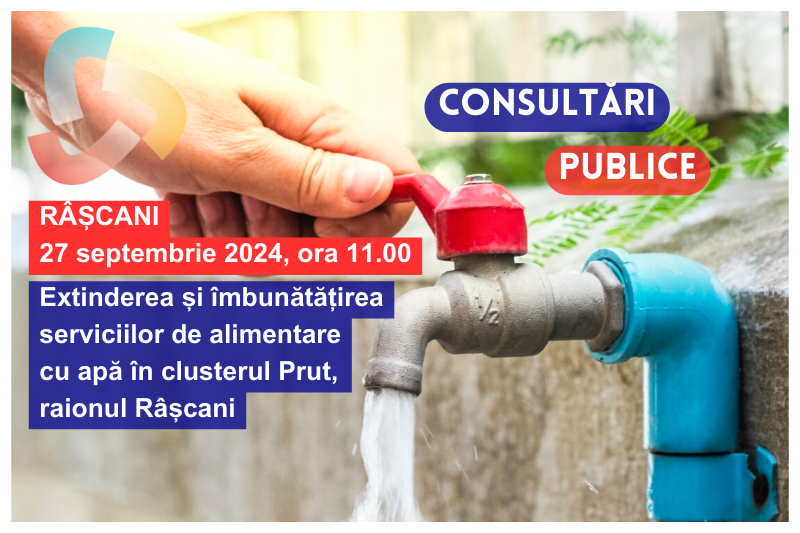 Invităm cetățenii interesați la consultările publice privind sub-proiectul „Extinderea și îmbunătățirea serviciilor de alimentare cu apă în clusterul Prut, raionul Râșcani” din cadrul proiectului „Securitatea aprovizionării cu apă și sanitație în Moldova”, implementat de Oficiul Național de Dezvoltare Regională și Locală (ONDRL) cu suportul Băncii Mondiale și Agenției Austriece de Dezvoltare (ADA). Mai multe informații despre proiect se găsesc la următorul link www.ondrl.gov.md/saasm sau, prin solicitare, de la Consiliu Raional Râșcani. Scopul acestor consultări publice este de a informa părțile interesate (locuitorii, organizațiile neguvernamentale, instituțiile publice, agenți economici și alte persoane / grupuri interesate) despre principalele obiective ale proiectului și despre realizarea Evaluării impactului social și de mediu și a Planului de management de mediu și social de compania Tehno Consulting & Design SRL. De asemenea, această ședință va reprezenta o oportunitate de comunicare cu populația privind anticiparea riscurilor de mediu și sociale în implementarea proiectului și de identificare a posibilelor măsuri de atenuare a impacturilor. Data desfășurării: vineri, 27 septembrie 2024, ora 11.00 Locație: Consiliul Raional Râșcani, etaj 1, sala de ședințe Pentru informații suplimentare privind organizarea consultărilor publice, vă rugăm să ne contactați la nr. tel. 069320090. Persoană de contact: Igor Frecăuțan, șef Secția Economie.