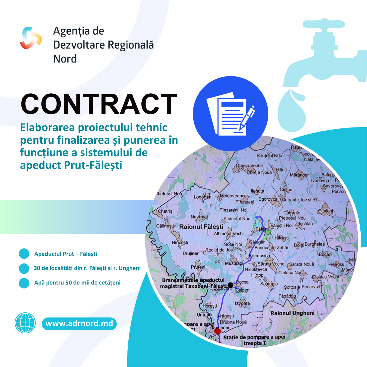 În Regiunea de Dezvoltare Nord începe elaborarea proiectului tehnic (reproiectare) pentru finalizarea și punerea în funcțiune a sistemului de apeduct Prut-Fălești. Marți, 21 ianuarie 2025, Agenția de Dezvoltare Regională (ADR) Nord și Consiliul Raional Fălești au semnat un contract privind achiziționarea serviciilor în acest sens cu SC „Apcan Proiect” SRL, operator economic desemnat câștigător al licitației deschise nr. ocds-b3wdp1-MD-1734126308382 din 6 ianuarie 2025. Valoarea contractului pentru elaborarea proiectului tehnic constituie 684.000 de lei. SC „Apcan Proiect” SRL s-a angajat să presteze serviciul solicitat în decurs de maximum cinci luni din data înregistrării rezultatelor acestei licitații la Agenția Achiziții Publice și emiterii certificatului de urbanism. Ulterior, după elaborarea proiectului tehnic, ADR Nord va lansa licitații publice pentru achiziționarea lucrărilor de construcție și serviciilor dirigintelui de șantier în cadrul proiectului „Finalizarea și punerea în funcțiune a sistemului de apeduct Prut-Fălești”, depus la Concursul de selectare a proiectelor de aprovizionare cu apă și sanitație, Programul de dezvoltare regională, apel pe listă, cu finanțare din Fondul Național pentru Dezvoltare Regională și Locală (ediția octombrie 2023). Noul proiect din raionul Fălești va răspunde nevoilor de furnizare a apei de calitate și serviciilor de aprovizionare cu apă pentru circa 50 de mii de cetățeni din 30 de localități din raioanele Fălești și Ungheni, prin efectuarea lucrărilor de construcție-montaj stabilite în versiunea actualizată a proiectului tehnic. Maria Prisacari, director ADR Nord: „Accesul la sursele sigure de apă potabilă este una dintre cele mai importante priorități în domeniul infrastructurii la nivel național, întrucât de apa potabilă consumată depinde în mare măsură sănătatea cetățenilor.” Lucrările de construcție-montaj a vechiului sistem de alimentare cu apă din râul Prut a localităților din raionul Fălești au demarat în anul 1984. De atunci, au fost realizate mai multe măsuri investiționale în acest sens. În anul 2012, după montarea unei stații de tratare a apei din orașul Fălești, apa din Prut nu a ajuns în casele făleștenilor din cauza vechiului apeduct magistral Prut-Fălești, care a cedat. Ulterior au urmat alte investiții pentru redresarea situației. Până în prezent, investițiile în apeductul Prut-Fălești constituie peste 100 mil. lei, sumă provenită atât din sursele Fondului Național pentru Dezvoltare Regională, cât și din alte surse de finanțare naționale. Prin intermediul ADR Nord, în raionul Fălești au fost implementate patru proiecte de alimentare cu apă și sanitație: (1) „Alimentarea orașului Fălești cu apă din râul Prut” (FNDRL); (2) „Aprovizionarea cu apă potabilă și canalizare a locuitorilor satelor Risipeni și Bocșa și a instituțiilor de menire social-culturală” (FNDRL) – bunurile rezultate în urma acestui proiect urmează să fie valorificate după punerea în funcțiune a apeductului Prut-Fălești; (3) „Asigurarea orașului Fălești cu apă din râul Prut 2” (FNDRL); (4) „Îmbunătățirea serviciilor de alimentare cu apă în orașul Fălești” (Uniunea Europeană).