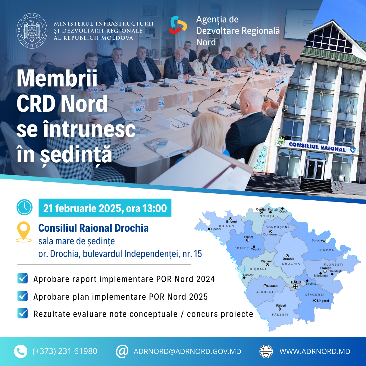 Ministerul Infrastructurii și Dezvoltării Regionale (MIDR) și Agenția de Dezvoltare Regională (ADR) Nord organizează prima ședință ordinară din acest an a Consiliului Regional pentru Dezvoltare (CRD) Nord. Întrunirea va avea loc vineri, 21 februarie 2025, cu începere de la ora 13.00, în incinta Consiliului Raional Drochia, sala mare de ședințe (or. Drochia, bulevardul Independenței, nr. 15). În cadrul ședinței, reprezentanții ADR Nord vor prezenta raportul de progres privind implementarea Programului Operațional Regional (POR) Nord 2024 și planul de implementare a POR Nord 2025. Totodată, vor fi prezentate rezultatele evaluării notelor conceptuale depuse în cadrul Concursului competitiv de selectare a proiectelor de dezvoltare regională, ediția 2024. La ședința CRD Nord vor participa viceprim-ministrul, ministrul Infrastructurii și Dezvoltării Regionale, Vladimir Bolea, membrii CRD Nord și specialiști ADR Nord. Agenda ședinței CRD Nord se găsește mai jos, la rubrica „Fișiere anexate”. Date de contact pentru informații suplimentare: tel. (231) 61980; e-mail: [email protected]. Ședința de constituire a CRD Nord de legislatura a V-a a avut loc în data de 25 aprilie 2024, la Bălți. CRD Nord este o structură regională deliberativă, fără personalitate juridică, constituită în vederea elaborării, coordonării și monitorizării politicii de dezvoltare regională la nivelul Regiunii de Dezvoltare Nord, în componența căreia intră municipiul Bălți și raioanele Briceni, Dondușeni, Drochia, Edineț, Fălești, Florești, Glodeni, Ocnița, Râșcani, Sângerei și Soroca. CRD Nord are 34 de membri, fiind alcătuit din 11 președinți de raioane și primarul mun. Bălți, care sunt desemnați din oficiu; 12 primari delegați de asociația primarilor din fiecare raion din cadrul regiunii de dezvoltare / mun. Bălți; 5 reprezentanți ai sectorului privat și 5 reprezentanți ai societății civile, selectați conform procedurii stabilite de autoritatea de elaborare a politicii de dezvoltare regională. Mai multe detalii despre CRD Nord se găsesc AICI.