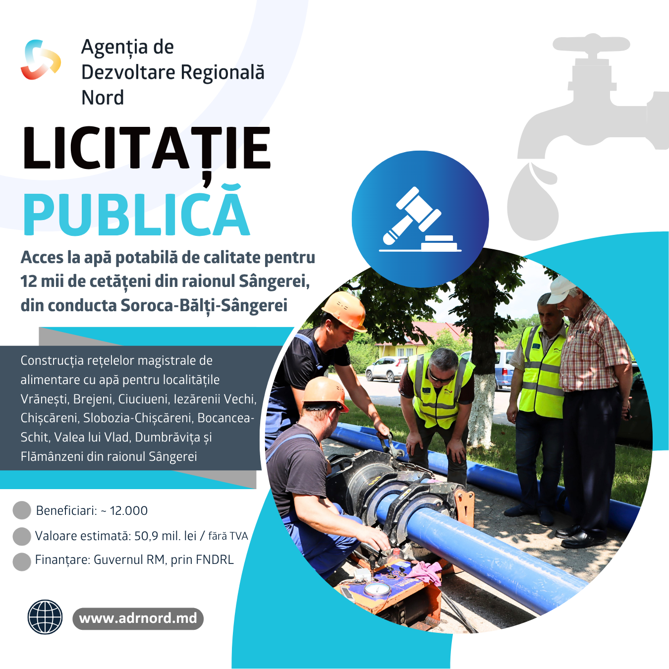Agenția de Dezvoltare Regională Nord a lansat procedura de licitație publică pentru executarea lucrărilor de construcții în cadrul proiectului „Construcția rețelelor magistrale de alimentare cu apă pentru localitățile Vrănești, Brejeni, Ciuciueni, Iezărenii Vechi, Chișcăreni, Slobozia-Chișcăreni, Flămânzeni, Dumbrăvița – localitățile raionului Sângerei – din conducta Soroca-Bălți-Sângerei”. Proiectul prevede sporirea gradului de acces la apă potabilă de calitate a populației din localitățile raionului Sângerei. În acest sens, 10 localități din raionul Sângerei urmează să fie conectate la apeductul regional Soroca-Bălți-Sângerei prin construcția unui apeduct magistral cu o lungime de 46 km. Este vorba de localitățile Vrănești, Brejeni, Ciuciueni, Iezărenii Vechi, Chișcăreni, Slobozia-Chișcăreni, Flămânzeni, Dumbrăvița, Bocancea-Schit și Valea lui Vlad, unde locuiesc circa 12 mii de cetățeni. Totodată, vor fi create premise pentru dezvoltarea serviciului regional de alimentare cu apă și în alte localități din raioanele Sângerei și Telenești. Valoarea totală a lucrărilor de construcții a fost estimată la 50.941.450 MDL, fără TVA. Proiectul este finanțat de Guvernul Republicii Moldova, prin Fondul Național pentru Dezvoltare Regională și Locală, cofinanțat de Consiliul Raional Sângerei și implementat de Agenția de Dezvoltare Regională Nord. Perioada clarificărilor: 2 octombrie 2025, 18:38 – 14 octombrie 2025, 12:00 Perioada de depunere a ofertelor: 14 octombrie 2025, 12:00 – 27 octombrie 2025, 11:00 Criteriu de atribuire: Prețul cel mai scăzut.