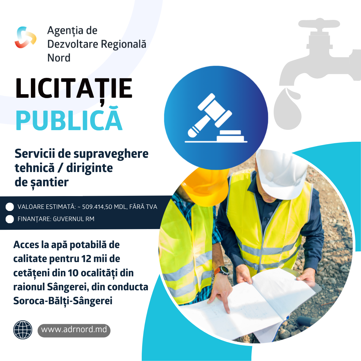 Agenția de Dezvoltare Regională Nord a lansat procedura de licitație publică pentru achiziționarea serviciilor de supraveghere tehnică (diriginte de șantier) în cadrul proiectului „Construcția rețelelor magistrale de alimentare cu apă pentru localitățile Vrănești, Brejeni, Ciuciueni, Iezărenii Vechi, Chișcăreni, Slobozia-Chișcăreni, Flămânzeni, Dumbrăvița – localitățile raionului Sângerei – din conducta Soroca-Bălți-Sângerei”. Proiectul prevede sporirea gradului de acces la apă potabilă de calitate a populației din localitățile raionului Sângerei. În acest sens, 10 localități din raionul Sângerei urmează să fie conectate la apeductul regional Soroca-Bălți-Sângerei prin construcția unui apeduct magistral cu o lungime de 46 km. Este vorba de localitățile Vrănești, Brejeni, Ciuciueni, Iezărenii Vechi, Chișcăreni, Slobozia-Chișcăreni, Flămânzeni, Dumbrăvița, Bocancea-Schit și Valea lui Vlad, unde locuiesc circa 12 mii de cetățeni. Totodată, vor fi create premise pentru dezvoltarea serviciului regional de alimentare cu apă și în alte localități din raioanele Sângerei și Telenești. Valoarea totală a serviciilor de supraveghere tehnică a fost estimată la 509.414,50 MDL, fără TVA. Proiectul este finanțat de Guvernul Republicii Moldova, prin Fondul Național pentru Dezvoltare Regională și Locală, cofinanțat de Consiliul Raional Sângerei și implementat de Agenția de Dezvoltare Regională Nord. Perioada clarificărilor: 3 octombrie 2025, 16:35 – 14 octombrie 2025, 12:00 Perioada de depunere a ofertelor: 14 oct 2025, 12:00 – 27 oct 2025, 11:00 Criteriu de atribuire: Prețul cel mai scăzut.