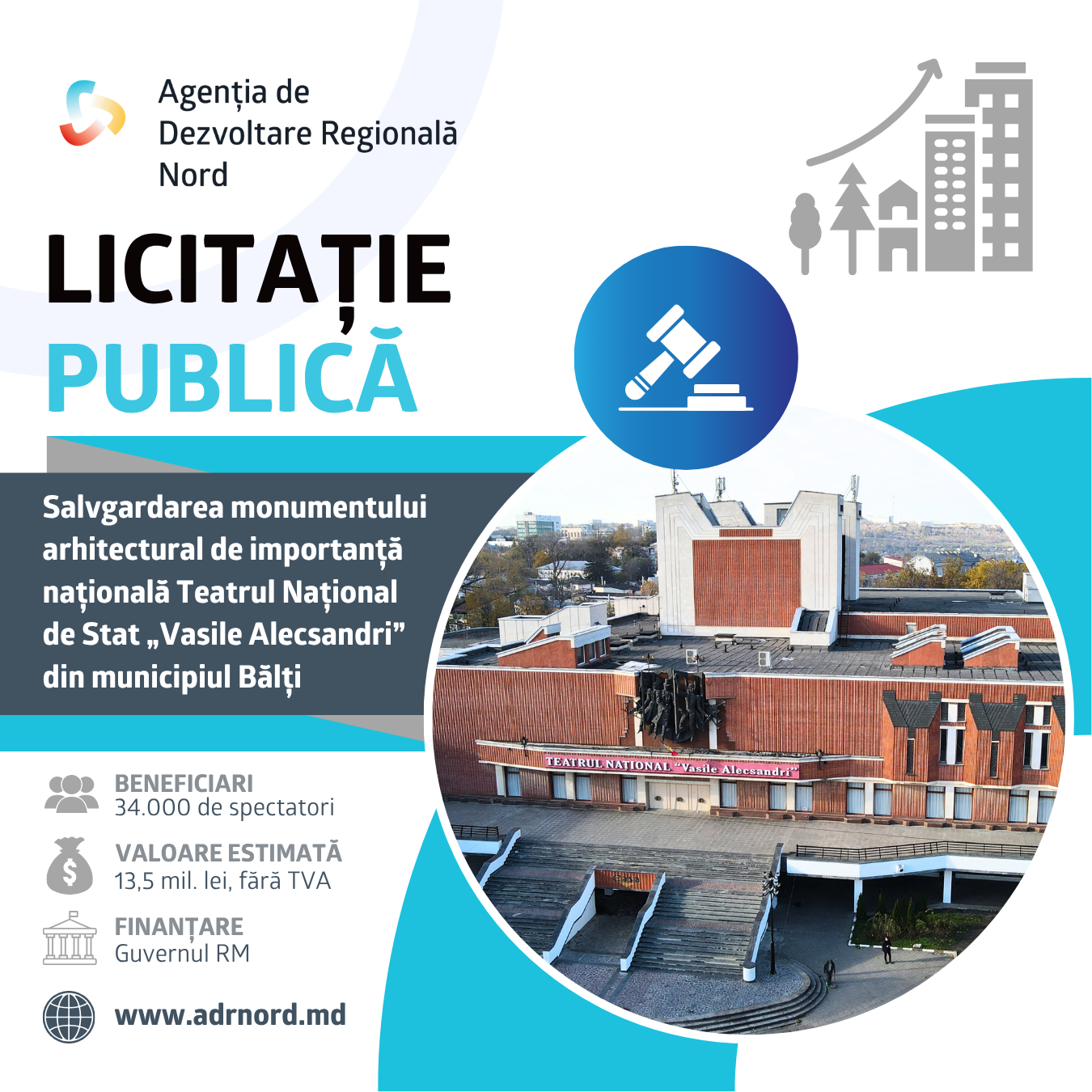 Agenția de Dezvoltare Regională Nord a lansat procedura de licitație publică pentru executarea lucrărilor de construcții în cadrul proiectului „Salvgardarea monumentului arhitectural de importanță națională Teatrul Național de Stat «Vasile Alecsandri» din municipiul Bălți”. Proiectul are în vedere renovarea Instituției Publice Teatrul Național de Stat „Vasile Alecsandri” prin reparația capitală a acoperișului cu o suprafață de 4.171 mp. Clădirea Teatrului din Bălți este un monument de arhitectură de importanță națională și singurul teatru cu statut național din nordul Republicii Moldova. Printre grupurile-țintă care vor beneficia de rezultatele acestui proiect se numără 104 angajați ai Teatrului din Bălți și circa 34 de mii de spectatori înregistrați anual de instituția teatrală. Printre beneficiarii proiectului mai sunt agenții economici din regiune și locuitorii municipiului Bălți și ai localităților limitrofe. În urma implementării proiectului, se așteaptă ca numărul beneficiarilor de servicii culturale să crească cu 5%. Valoarea totală a lucrărilor de construcții a fost estimată la 13.546.085,78 MDL, fără TVA. Proiectul este finanțat de Guvernul Republicii Moldova, prin Fondul Național pentru Dezvoltare Regională și Locală, cofinanțat de Teatrul Național de Stat „Vasile Alecsandri” din Bălți și implementat de Agenția de Dezvoltare Regională Nord. Perioada clarificărilor: 9 octombrie 2025, 18:30 – 21 octombrie 2025, 12:00 Perioada de depunere a ofertelor: 21 octombrie 2025, 12:00 – 3 noiembrie 2025, 11:00 Criteriu de atribuire: Prețul cel mai scăzut.