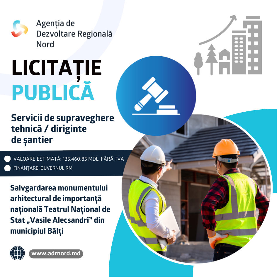 Agenția de Dezvoltare Regională Nord a lansat procedura de licitație publică pentru achiziționarea serviciilor de supraveghere tehnică (diriginte de șantier) în cadrul proiectului „Salvgardarea monumentului arhitectural de importanță națională Teatrul Național de Stat «Vasile Alecsandri» din municipiul Bălți”. Proiectul are în vedere renovarea Instituției Publice Teatrul Național de Stat „Vasile Alecsandri” prin reparația capitală a acoperișului cu o suprafață de 4.171 mp. Clădirea Teatrului din Bălți este un monument de arhitectură de importanță națională și singurul teatru cu statut național din nordul Republicii Moldova. Printre grupurile-țintă care vor beneficia de rezultatele acestui proiect se numără 104 angajați ai Teatrului din Bălți și circa 34 de mii de spectatori înregistrați anual de instituția teatrală. Printre beneficiarii proiectului mai sunt agenții economici din regiune și locuitorii municipiului Bălți și ai localităților limitrofe. În urma implementării proiectului, se așteaptă ca numărul beneficiarilor de servicii culturale să crească cu 5%. Valoarea totală a serviciilor de supraveghere tehnică a fost estimată la 135.460,85 MDL, fără TVA. Proiectul este finanțat de Guvernul Republicii Moldova, prin Fondul Național pentru Dezvoltare Regională și Locală, cofinanțat de Teatrul Național de Stat „Vasile Alecsandri” din Bălți și implementat de Agenția de Dezvoltare Regională Nord. Perioada clarificărilor: 9 octombrie 2025, 18:43 – 21 octombrie 2025, 12:00 Perioada de depunere a ofertelor: 21 octombrie 2025, 12:00 – 3 noiembrie 2025, 11:00 Criteriu de atribuire: Prețul cel mai scăzut.
