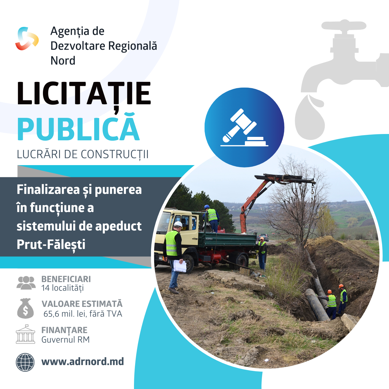 Agenția de Dezvoltare Regională Nord a lansat procedura de licitație publică pentru executarea lucrărilor de construcții în cadrul proiectului „Finalizarea și punerea în funcțiune a sistemului de apeduct Prut-Fălești”. Acest proiect va răspunde nevoilor de furnizare a apei de calitate și serviciilor de aprovizionare cu apă din râul Prut pentru 14 localități din raioanele Fălești și Ungheni, prin efectuarea lucrărilor de construcție-montaj stabilite în versiunea actualizată a proiectului tehnic. În prima etapă, noul proiect prevede construcția aducțiilor cu o lungime totală de 15 km către orașul Fălești și localitățile Sculeni (s. Gherman), Horești (s. Lucăceni, s. Unteni), Risipeni (s. Bocșa), Izvoare, Călugăr (s. Frumușica), Făleștii Noi, Albinețul Vechi și Năvârneț. De asemenea, este planificată construcția unei aducții magistrale cu o lungime 1,5 km și se prevede posibilitatea renovării a 4,5 km de apeduct magistral existent. Implementarea proiectului „Finalizarea și punerea în funcțiune a sistemului de apeduct Prut-Fălești” a fost divizată în două etape: proiectarea (reproiectare) și lucrările de construcții. Reproiectarea documentației tehnice s-a încheiat în august 2025. Valoarea totală a lucrărilor de construcții a fost estimată la 65.618.050 MDL, fără TVA. Proiectul este finanțat de Guvernul Republicii Moldova, prin Fondul Național pentru Dezvoltare Regională și Locală, cofinanțat de Consiliul Raional Fălești și implementat de Agenția de Dezvoltare Regională Nord. Lucrările de construcție-montaj a vechiului sistem de alimentare cu apă din râul Prut a localităților din raionul Fălești au demarat în anul 1984. De atunci, au fost realizate mai multe măsuri investiționale în acest sens. În anul 2012, după montarea unei stații de tratare a apei din orașul Fălești, apa din Prut nu a ajuns în casele făleștenilor din cauza vechiului apeduct magistral Prut-Fălești, care a cedat. Ulterior au urmat alte investiții pentru redresarea situației. Perioada clarificărilor: 8 decembrie 2025, 19:03 – 19 decembrie 2025, 12:00 Perioada de depunere a ofertelor: 19 decembrie 2025, 12:00 – 30 decembrie 2025, 11:00 Criteriu de atribuire: Prețul cel mai scăzut.