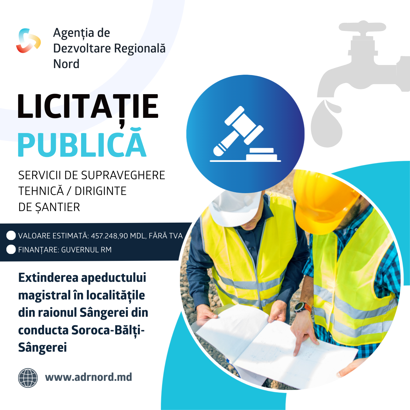 Agenția de Dezvoltare Regională Nord a lansat procedura de licitație publică pentru achiziționarea serviciilor de supraveghere tehnică (diriginte de șantier) în cadrul proiectului „Extinderea apeductului magistral în localitățile din raionul Sângerei din conducta Soroca-Bălți-Sângerei”. Proiectul prevede extinderea apeductului pe o distanță de 43,29 km, asigurându-se astfel accesul la apă potabilă pentru opt localități din raion, unde locuiesc circa 32 de mii de oameni. Totodată, noul proiect va permite ca apeductul magistral construit anterior, cu o lungime de 32,79 km, să fie pus în funcțiune în 10 localități din raionul Sângerei. Urmează să fie executate lucrări de construcție-montaj pentru extinderea apeductului pe două direcții: (1) direcția Rădoaia-Izvoare-Drăgănești-Cotiujenii Mici (21,32 km), unde se planifică construcția rețelelor exterioare de alimentare cu apă, construcția unei stații de pompare a apei, construcția rețelelor electrice și lucrări de amenajare a teritoriului și (2) direcția Sângerei-Grigorăuca-Copăceni-Prepelița, unde se planifică construcția rețelelor exterioare de alimentare cu apă și lucrări de amenajare a teritoriului. În perioada post-implementare, acest proiect poate fi extins pe o arie geografică mai vastă, incluzând noi localități beneficiare din raionul Sângerei, dar și din raionul Telenești (Regiunea de Dezvoltare Centru), unde situația de aprovizionare cu apă este mai gravă decât în raionul Sângerei. Valoarea totală a serviciilor de supraveghere tehnică a fost estimată la 457.248,90 MDL, fără TVA. Proiectul este finanțat de Guvernul Republicii Moldova, prin Fondul Național pentru Dezvoltare Regională și Locală, cofinanțat de Consiliul Raional Sângerei și implementat de Agenția de Dezvoltare Regională Nord. Perioada clarificărilor: 25 decembrie 2025, 19:01 – 6 ianuarie 2026, 12:00 Perioada depunerii ofertelor: 6 ianuarie 2026, 12:00 – 19 ianuarie 2026, 11:00 Criteriu de atribuire: Prețul cel mai scăzut