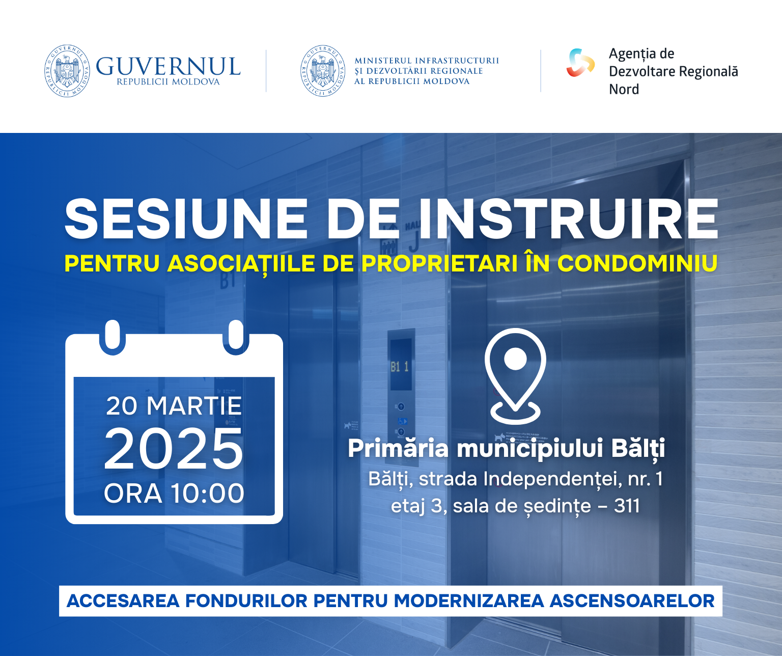 Data: 20 martie 2026 Agenția de Dezvoltare Regională Nord invită administratorii Asociațiilor de proprietari în condominiu la o sesiune de instruire organizată în contextul lansării de către Ministerul Infrastructurii și Dezvoltării Regionale a Concursului de selectare a proiectelor de dezvoltare regională – apel pe listă (ediția martie 2026). În cadrul concursului este disponibilă Măsura 2.3 „Revitalizare urbană și dezvoltarea infrastructurii spațiilor publice”, care oferă finanțare pentru modernizarea și înlocuirea ascensoarelor din blocurile multietajate în municipiul Bălți și în alte orașe din regiune. Finanțare disponibilă: până la 1.000.000 de lei / proiect Cine poate aplica? Ce vei afla la instruire?