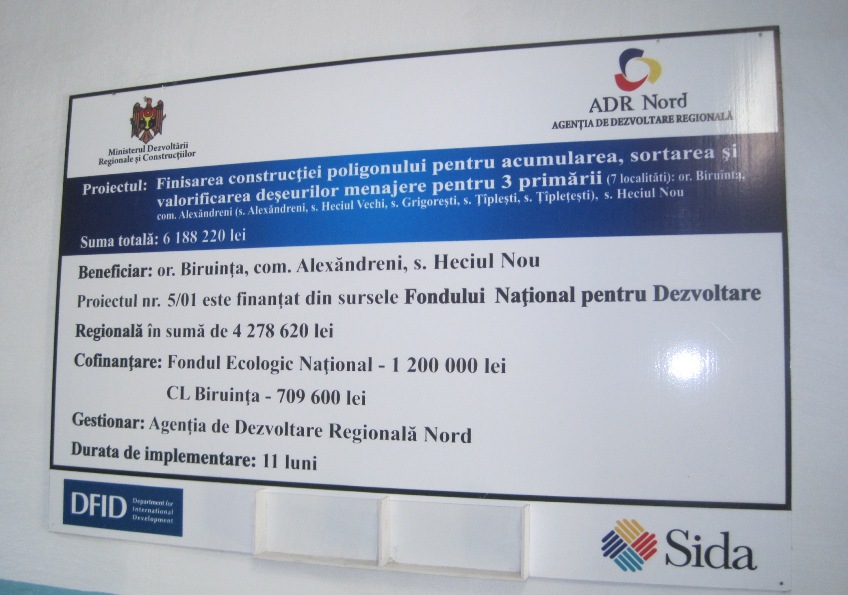 Solicitantul proiectului „Finisarea construcției poligonului pentru acumularea, sortarea și valorificarea deșeurilor menajere pentru 3 primării (7 localități): or. Biruința, Alexăndreni (s. Alexăndreni, s. Heciul Vechi, s. Grigorești, s. Tîplești, s. Țîpletești), s. Heciul Nou” este Primăria orașului Biruința, raionul Sîngerei. Suma totală a proiectului este de 6 091 195,00 lei, din care 4 287 617,76 lei vor fi alocați de Fondul Național de Dezvoltare Regională (FNDR). Durata de implementare este programată pentru 11 luni.