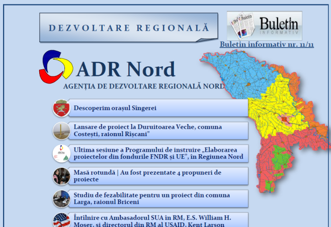 Agenția de Dezvoltare Regională Nord (ADR Nord) a elaborat Buletinul informativ nr. 11 / noiembrie 2011. Buletinul, atașat mai jos, este o sinteză a activităților Agenției în luna noiembrie a.c. ADR Nord va difuza, în format electronic, nr. 11 al Buletinului informativ membrilor CNDR, CRD, angajaților MDRC, ONG-urilor, societății civile, partenerilor de dezvoltare și mass-mediei.